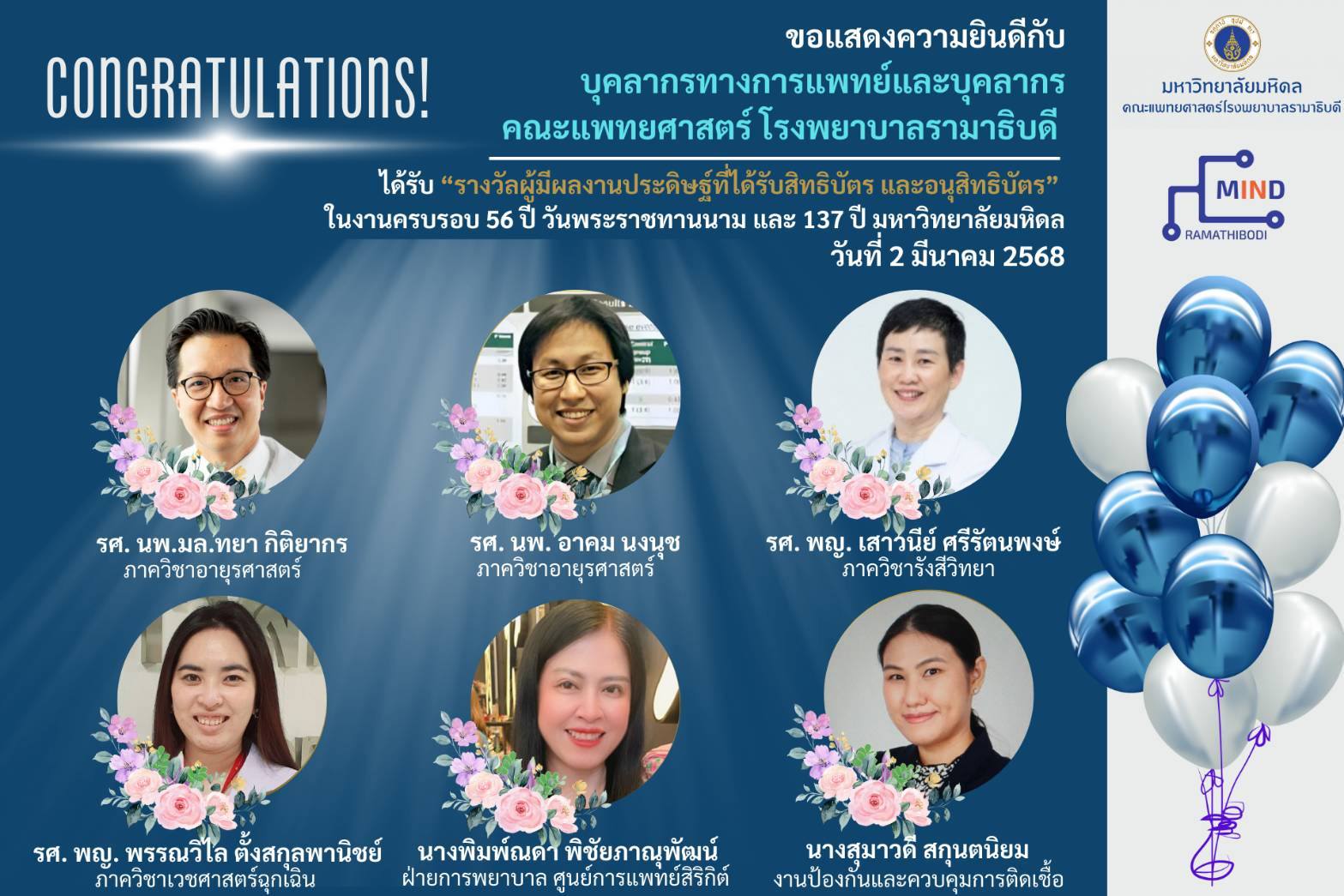 ศูนย์พัฒนานวัตกรรมทางการแพทย์ (MIND Center) คณะแพทยศาสตร์โรงพยาบาลรามาธิบดี ขอแสดงความยินดีและชื่นชมบุคลากรทางการแพทย์และบุคลากรของคณะแพทยศาสตร์ โรงพยาบาลรามาธิบดี มหาวิทยาลัยมหิดล ทั้ง 6 ท่าน ที่ได้รับ "รางวัลผู้ประดิษฐ์ที่ได้รับสิทธิบัตรและอนุสิทธิบัตร" ในโอกาสวันครบรอบ 56 ปี วันพระราชทานนาม และ 137 ปี มหาวิทยาลัยมหิดล เมื่อวันที่ 2 มีนาคม 2568 ที่ผ่านมา ณ มหาวิทยาลัยมหิดล ศาลายา โดยมีรายชื่อผู้ได้รับจำนวน 6 ท่าน 7 ผลงานดังนี้