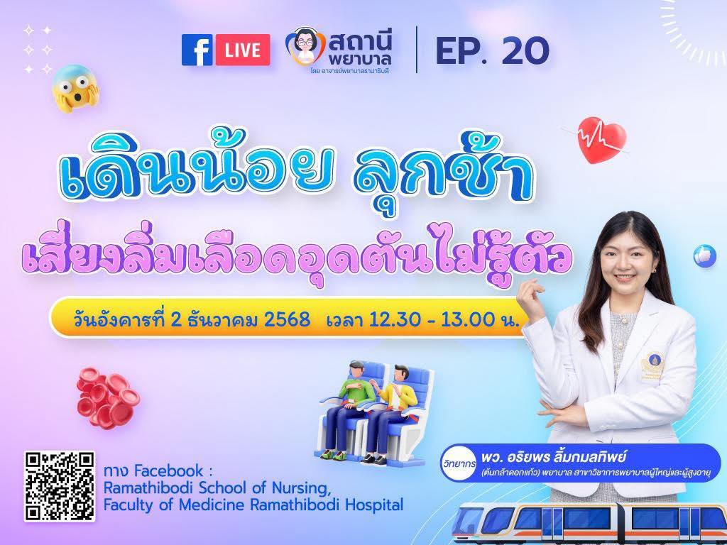 On December 2, 2025, Ramathibodi School of Nursing, Faculty of Medicine Ramathibodi Hospital, Mahidol University, hosted “Nurse Station” Episode 20: “Move Less…Rise Slowly…Risk of Deep Vein Thrombosis.” The episode was presented by RN Ariyaporn Limkamontip (Ton-Kla Dok-Kaew nurse) from the Adult and Gerontological Nursing Division, Ramathibodi School of Nursing, Faculty of Medicine Ramathibodi Hospital, Mahidol University.