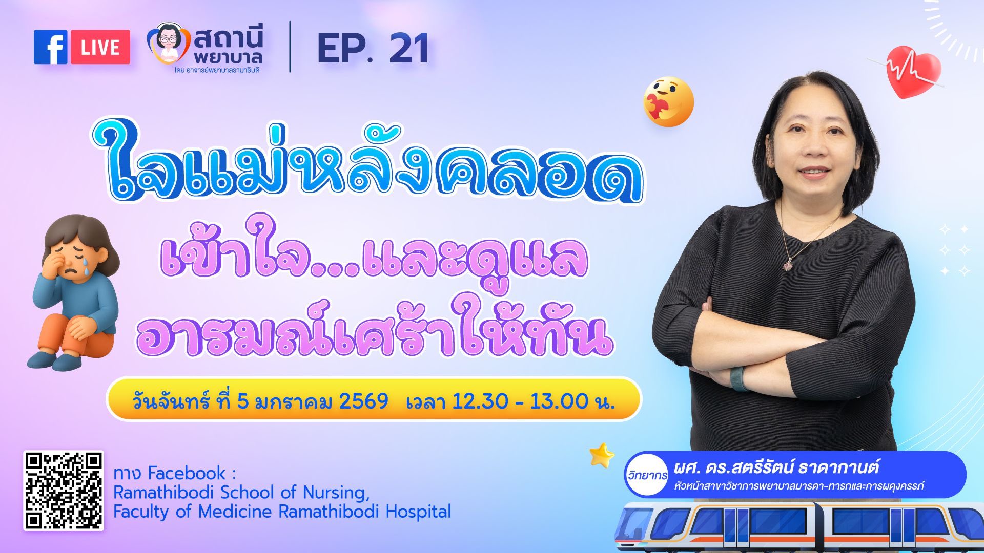 On January 5, 2026, Ramathibodi School of Nursing, Faculty of Medicine Ramathibodi Hospital, Mahidol University, hosted “Nurse Station” Episode 21: “Understanding and Supporting a Mother’s Postpartum Emotions.” The episode was presented by Assistant Professor Dr. Streerut Thadakant, Chair of the Division of Maternal Newborn Nursing and Midwifery, Ramathibodi School of Nursing, Faculty of Medicine Ramathibodi Hospital, Mahidol University.