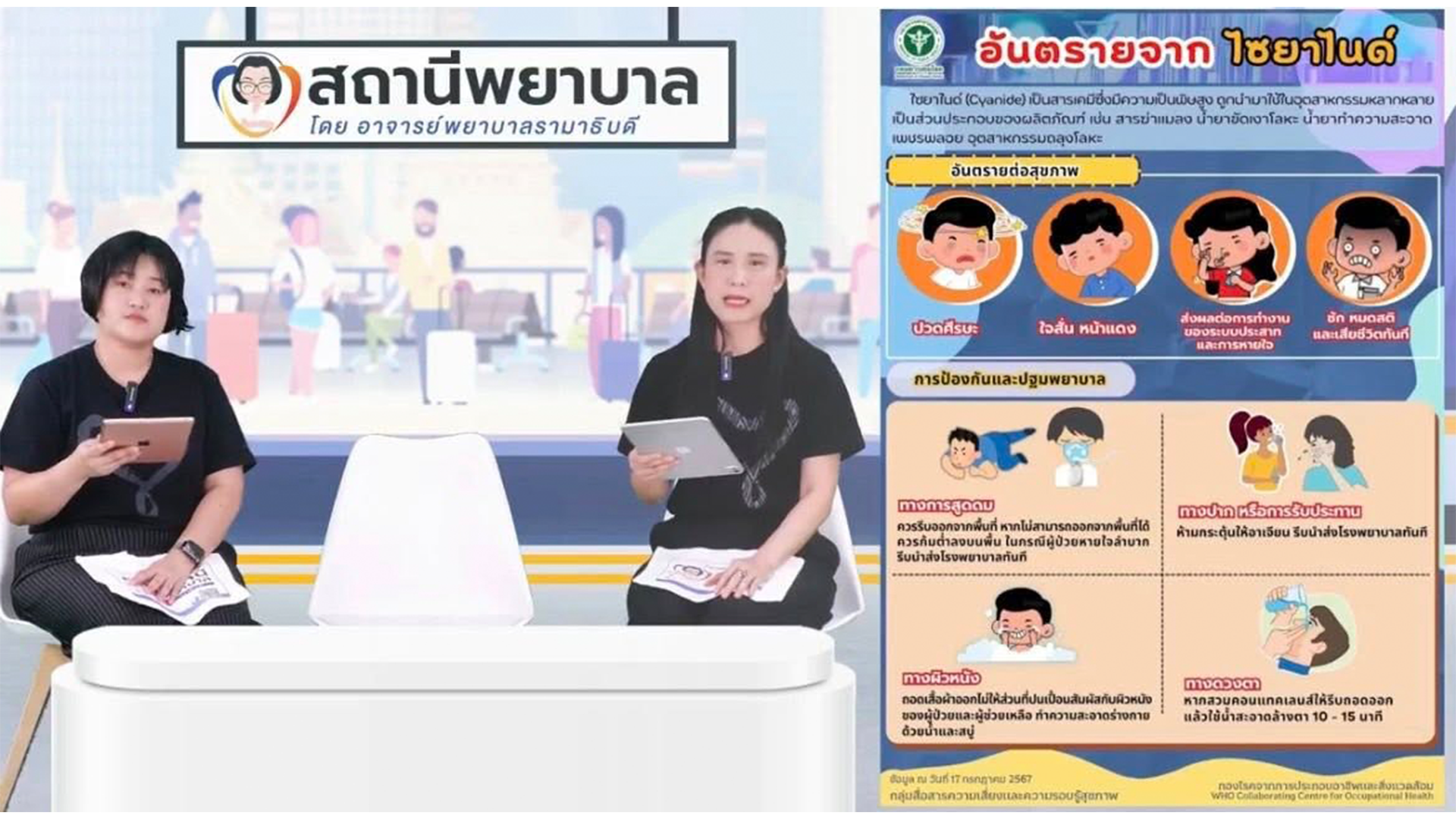 The sections “Talk to Nurses,” “Q&A,” and “Nursing (Not-So-Secret) Tips” focused on the topic “The Risks of Cyanide,” were led by Dr. Siriporn Nirapun, an Instructor from the Division of Pediatric Nursing, along with Dr. Taevika Choakprasanchai, an Instructor from the Division of Maternal Newborn Nursing and Midwifery, Ramathibodi School of Nursing.