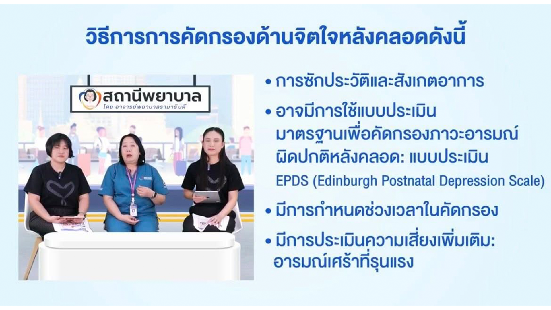 “Nurse Station” Episode 21: “Understanding and Supporting a Mother’s Postpartum Emotions” hosted by faculty members of Ramathibodi School of Nursing, Faculty of Medicine Ramathibodi Hospital, Mahidol University.