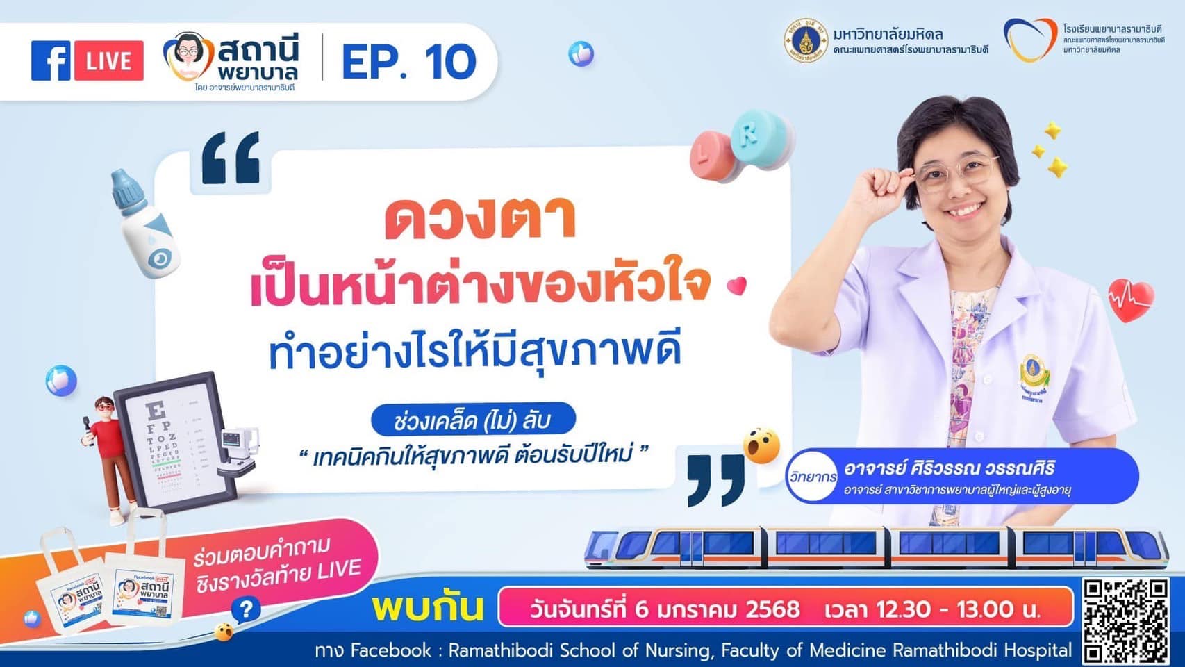 On January 6, 2025, Ramathibodi School of Nursing, Faculty of Medicine Ramathibodi Hospital, Mahidol University, hosted the “Nurse Station” Episode 10: “The Eyes are the Window to the Soul...How to Stay Healthy?” The episode was presented by Nursing Instructor Siriwan Wannasiri from the Division of Adult and Gerontological Nursing, Ramathibodi School of Nursing, Faculty of Medicine Ramathibodi Hospital, Mahidol University.
