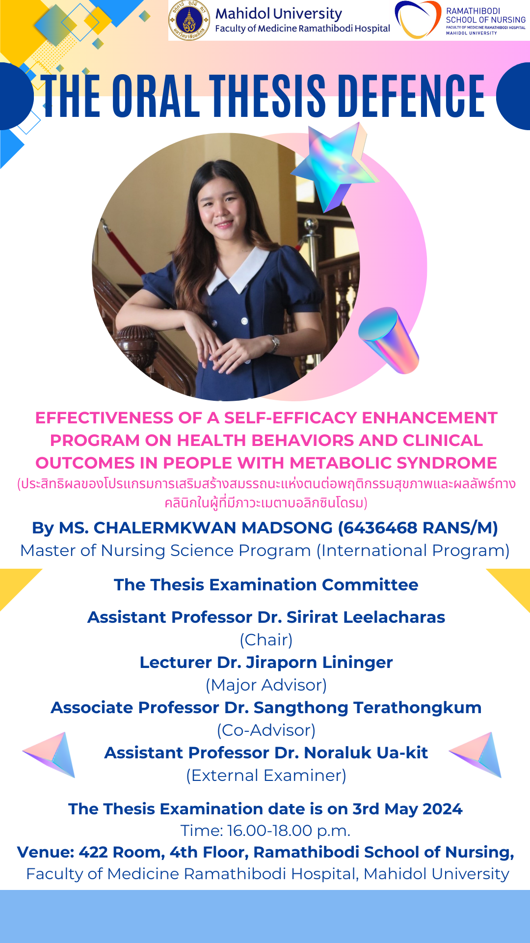 Thesis Title: “EFFECTIVENESS OF A SELF-EFFICACY ENHANCEMENT PROGRAM ON HEALTH BEHAVIORS AND CLINICAL OUTCOMES IN PEOPLE WITH METABOLIC SYNDROME” (ประสิทธิผลของโปรแกรมการเสริมสร้างสมรรถนะแห่งตนต่อพฤติกรรมสุขภาพและผลลัพธ์ทางคลินิกในผู้ที่มีภาวะเมตาบอลิกซินโดรม)