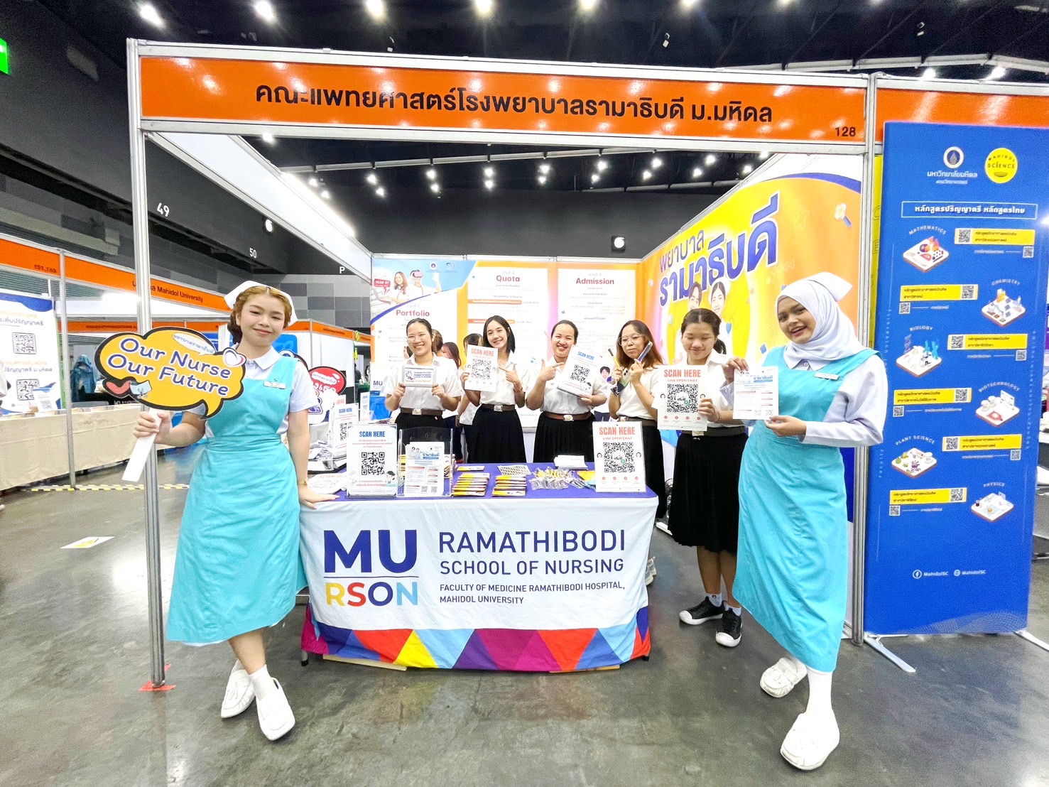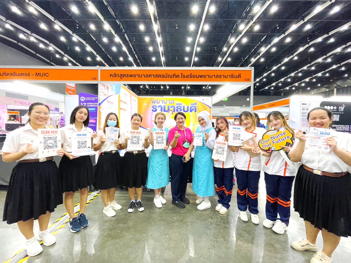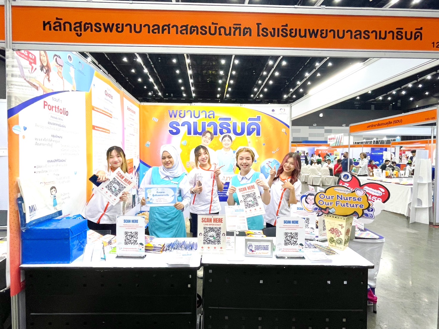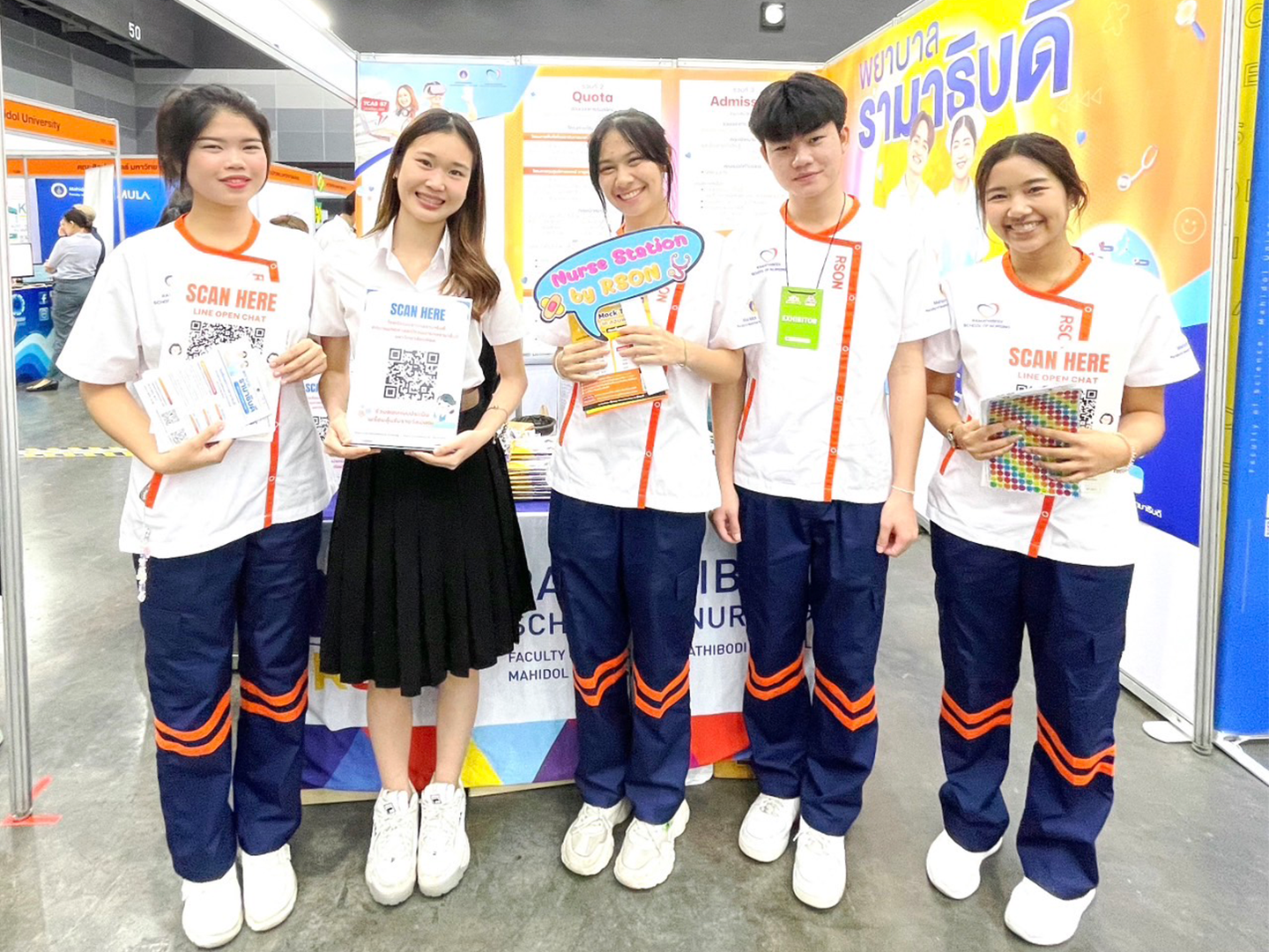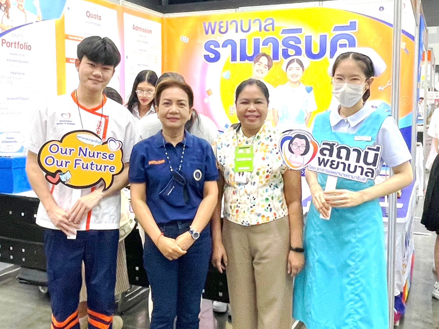 Assistant Professor Dr. Siranee Kejkornkaew, Deputy Director for Nursing Education of Ramathibodi School of Nursing, along with Assistant Professor Dr. Dalin Rattanasuk, an instructor from the Division of Adult and Gerontological Nursing, Instructor Pornsiri Phugsachart from the Division of Psychiatric and Mental Health Nursing, and Instructor Dr. Sangduen Piyatrakul from the Division of Community Health Nursing, Ramathibodi School of Nursing, Faculty of Medicine Ramathibodi Hospital, Mahidol University, led the team of staff and 1st, 2nd, and 3rd-Year Ramathibodi nursing students, hosting a booth to give advice and information about TCAS67 and admission criteria for high school students who are interested in becoming nurses and enrolling in Ramathibodi School of Nursing.