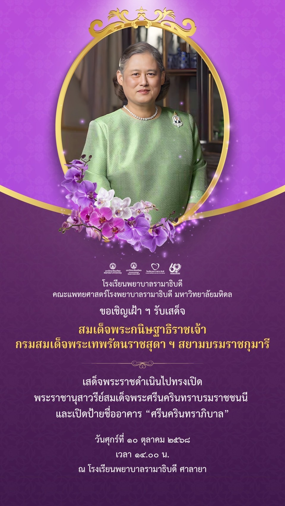 ขอเชิญเฝ้าฯ รับเสด็จ สมเด็จพระกนิษฐาธิราชเจ้า กรมสมเด็จพระเทพรัตนราชสุดาฯ สยามบรมราชกุมารี เสด็จพระราชดำเนินไปทรงเปิด พระราชานุสาวรีย์สมเด็จพระศรีนครินทราบรมราชชนนี และเปิด ป้ายชื่ออาคาร “ศรีนครินทราภิบาล”