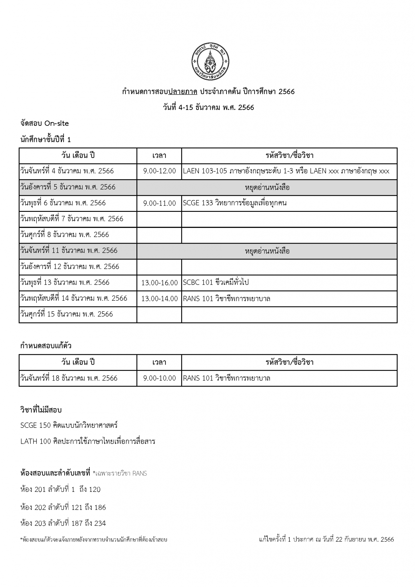 นักศึกษาชั้นปีที่ 1 (สอบปลายภาค)