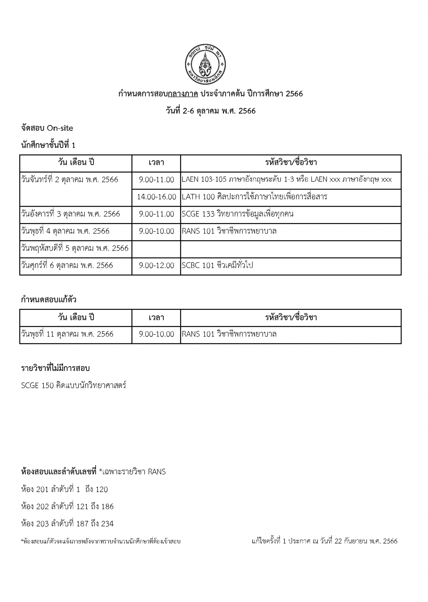 นักศึกษาชั้นปีที่ 1 (สอบกลางภาค)