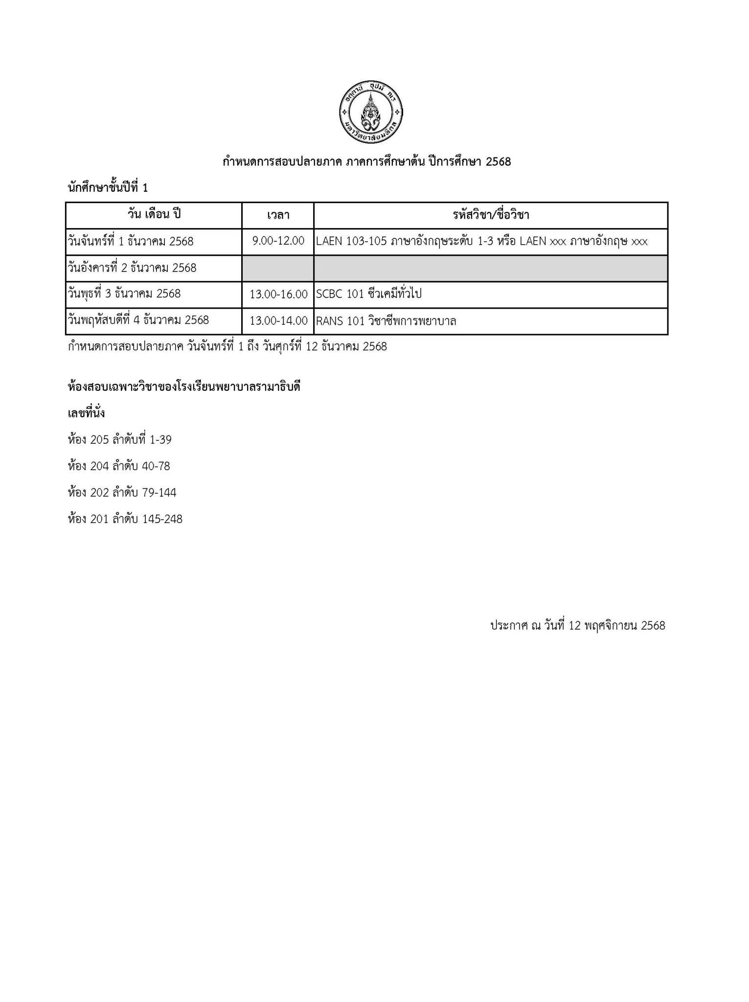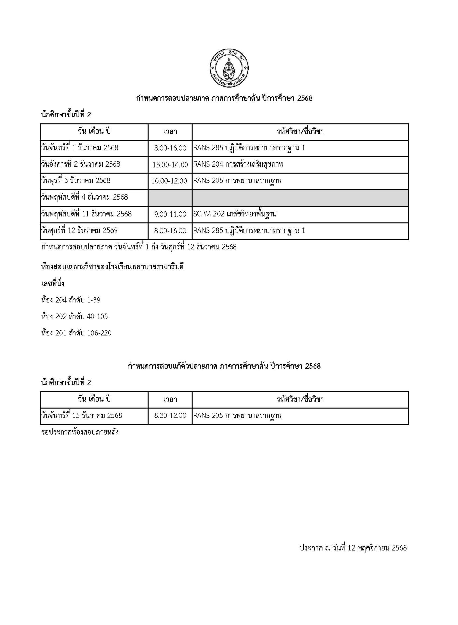 กำหนดการสอบ ปีการศึกษา 2568 ของนักศึกษาพยาบาลชั้นปีที่ 1,2