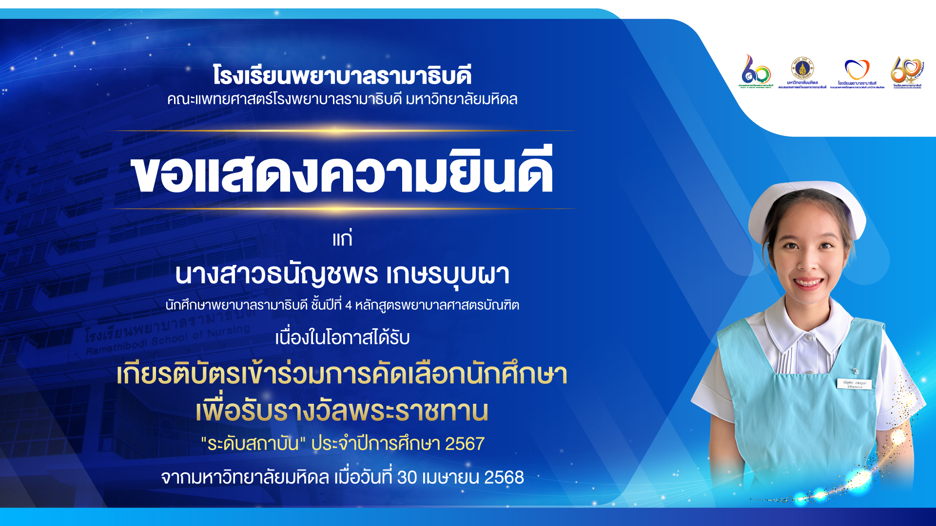 ขอแสดงความยินดี แก่ นางสาวธนัญชพร เกษรบุบผา นักศึกษาพยาบาลรามาธิบดี ชั้นปีที่ 4 หลักสูตรพยาบาลศาสตรบัณฑิต