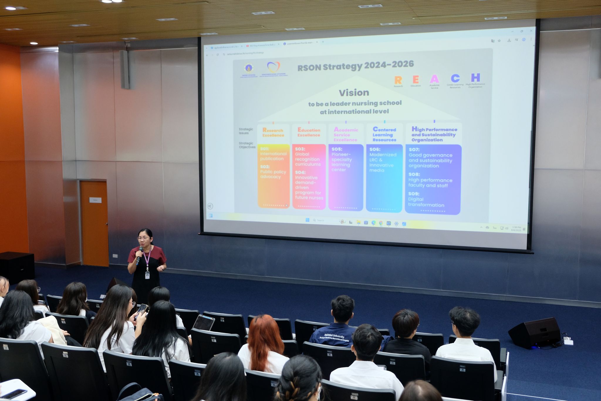 วันที่ 6 สิงหาคม 2568 รองศาสตราจารย์ ดร.พูลสุข เจนพานิชย์ วิสุทธิพันธ์ ผู้อำนวยการโรงเรียนพยาบาลรามาธิบดี คณะแพทยศาสตร์โรงพยาบาลรามาธิบดี มหาวิทยาลัยมหิดล ให้เกียรติเป็นประธานกล่าวเปิดงาน “ปฐมนิเทศนักศึกษาพยาบาลรามาธิบดี ชั้นปีที่ 2” ประจำปีการศึกษา 2568 โดยมี อาจารย์ ดร.เขมณัฏฐ์ ยุทธวิสุทธิ์ อาจารย์ สาขาวิชาการพยาบาลพื้นฐาน และอาจารย์ ดร.ฉัตรศิริ เมฆวิวัฒนาวงศ์ อาจารย์ สาขาวิชาการพยาบาลสุขภาพชุมชน และอาจารย์ประจำชั้น ร่วมกล่าวต้อนรับนักศึกษาในโอกาสเปิดเทอมใหม่ ในโอกาสนี้ รองศาสตราจารย์ ดร.ศิราณี เก็จกรแก้ว รองผู้อำนวยการฯ ฝ่ายการศึกษาพยาบาลศาสตร์ กล่าวแนะนำการเรียนการสอน และการเตรียมตัวสำหรับนักศึกษาพยาบาลรามาธิบดี ชั้นปีที่ 2 พร้อมด้วย ผู้ช่วยศาสตราจารย์ ดร.องุ่น น้อยอุดม ผู้ช่วยผู้อำนวยการฯ ด้านกิจการนักศึกษา กล่าวถึงการเตรียมความพร้อมในการปฏิบัติตัว กฎระเบียบ กิจกรรมสำคัญต่าง ๆ และการเก็บชั่วโมง AT ผู้ช่วยศาสตราจารย์ ดร.มาลาตี รุ่งเรืองศิริพันธ์ ผู้ช่วยผู้อำนวยการฯ ด้านคุณภาพและบริหารความเสี่ยง กล่าวแนะนำโครงการปรึกษาอุ่นใจ อาจารย์ ดร.จิราพร ไลนิงเกอร์ รองผู้อำนวยการฯ ฝ่ายวิเทศสัมพันธ์ กล่าวแนะนำโครงการแลกเปลี่ยนนักศึกษาไปต่างประเทศ และทุนแลกเปลี่ยน โดยมี คณาจารย์ และอาจารย์ประจำชั้น ร่วมกล่าวต้อนรับ พร้อมทั้ง แนะนำการเรียนการสอนในหลักสูตรพยาบาลศาสตรบัณฑิต รวมถึงการพูดคุยเกี่ยวกับวัฒนธรรมองค์กร การสร้างความเข้าใจในเรื่องต่าง ๆ ให้แก่ นักศึกษาพยาบาลรามาธิบดี ชั้นปีที่ 2