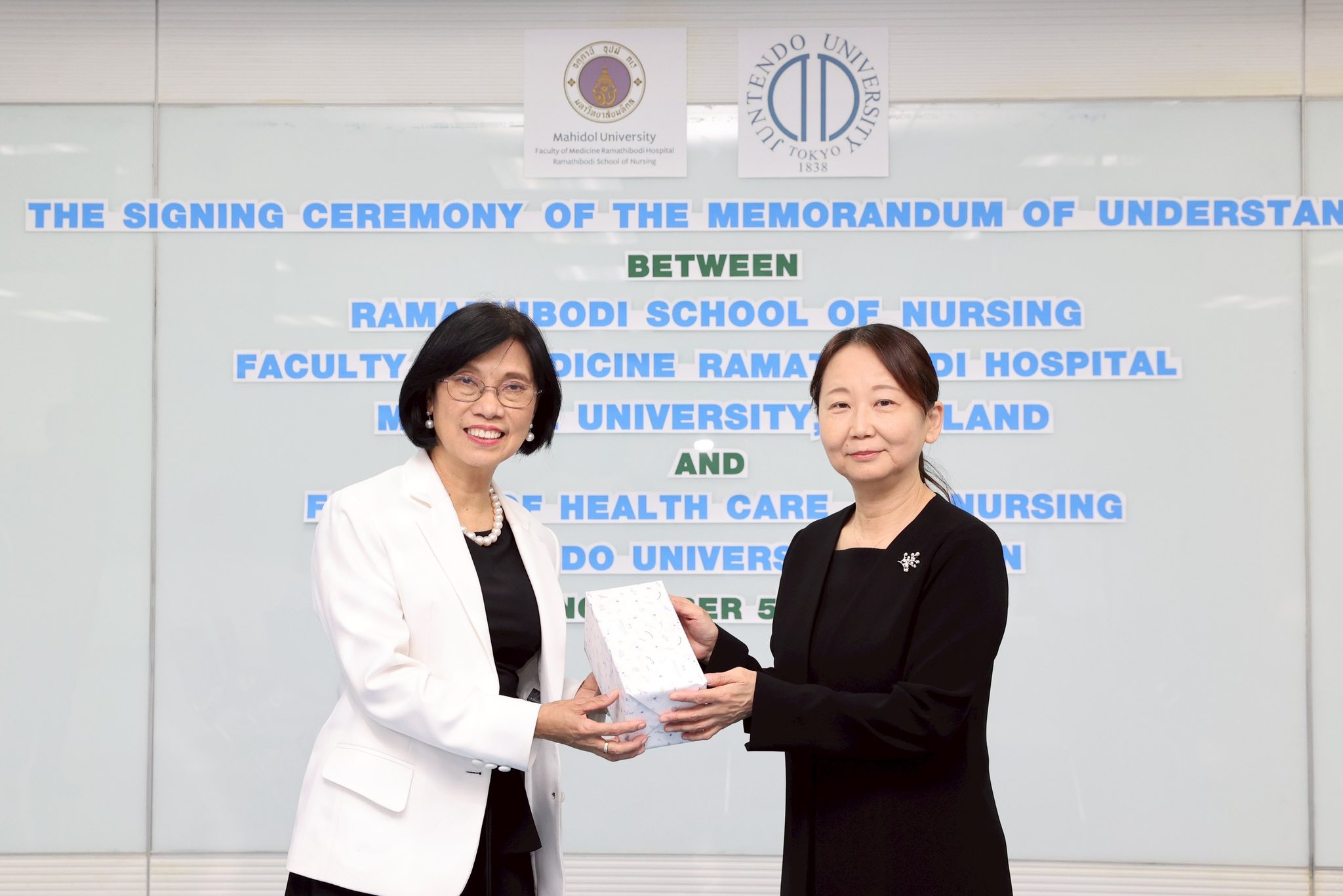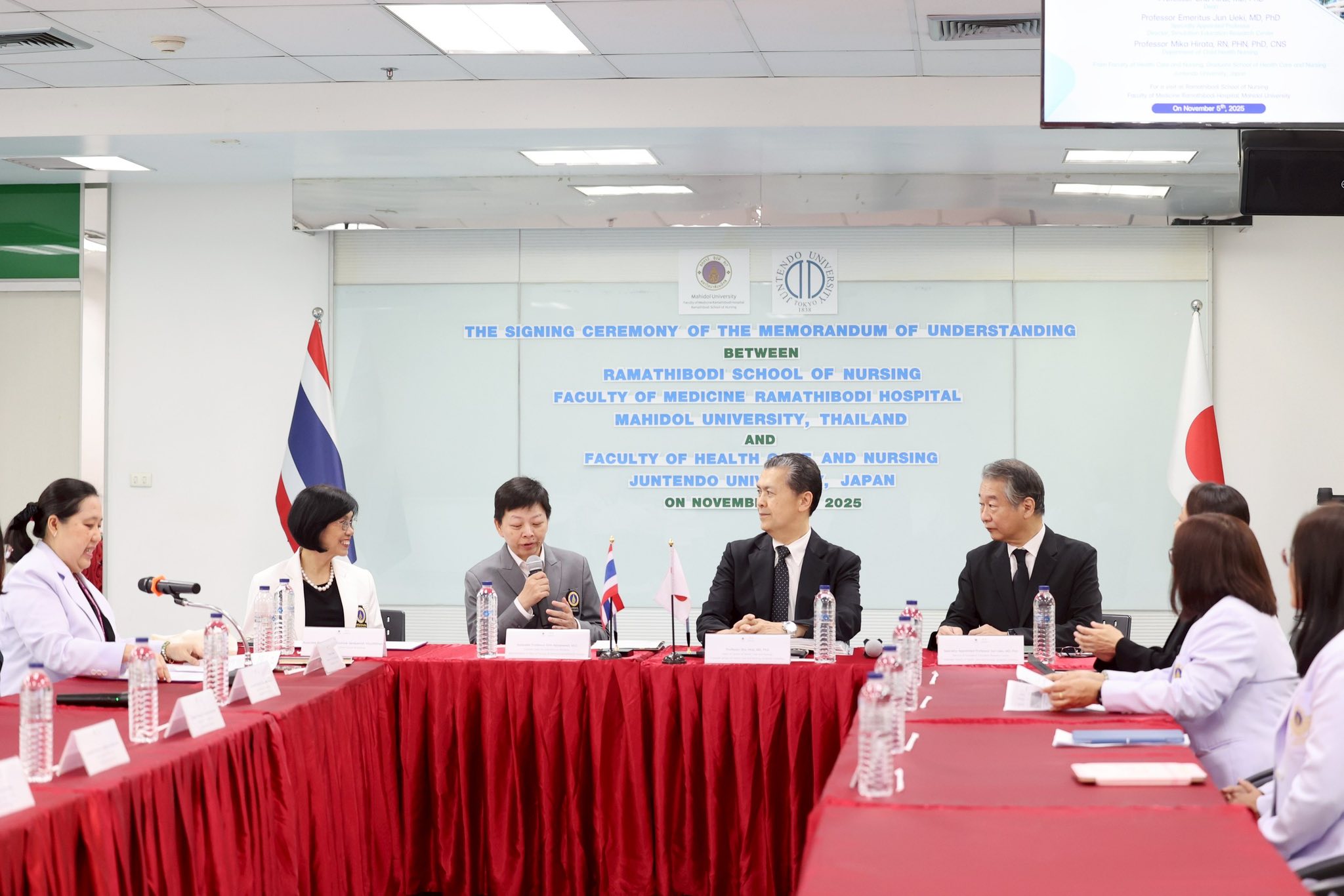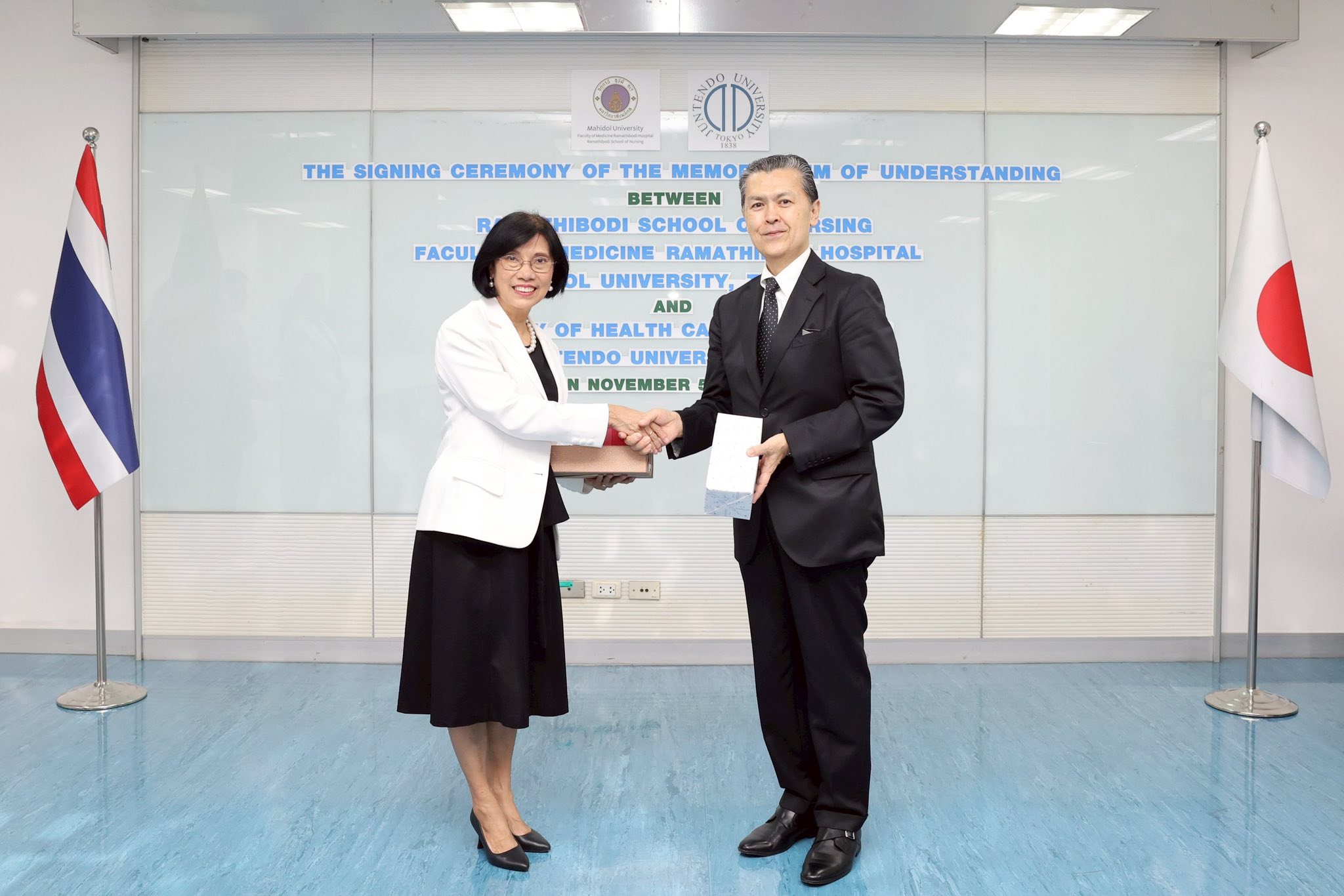 พิธีลงนามบันทึกข้อตกลงความร่วมมือทางวิชาการ (MOU) ระหว่าง โรงเรียนพยาบาลรามาธิบดี คณะแพทยศาสตร์โรงพยาบาลรามาธิบดี มหาวิทยาลัยมหิดล กับ Faculty of Health Care and Nursing, Juntendo University ประเทศญี่ปุ่น