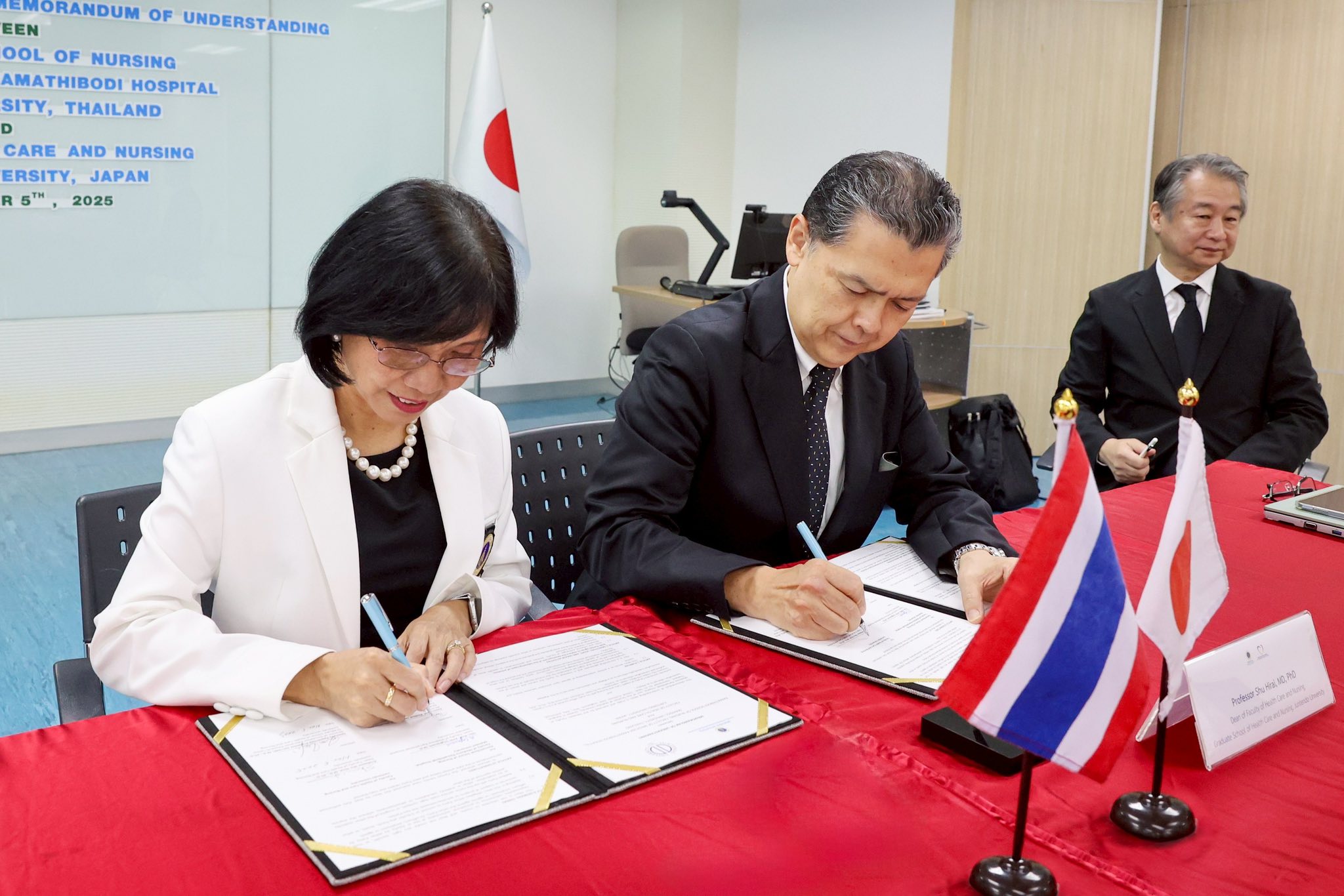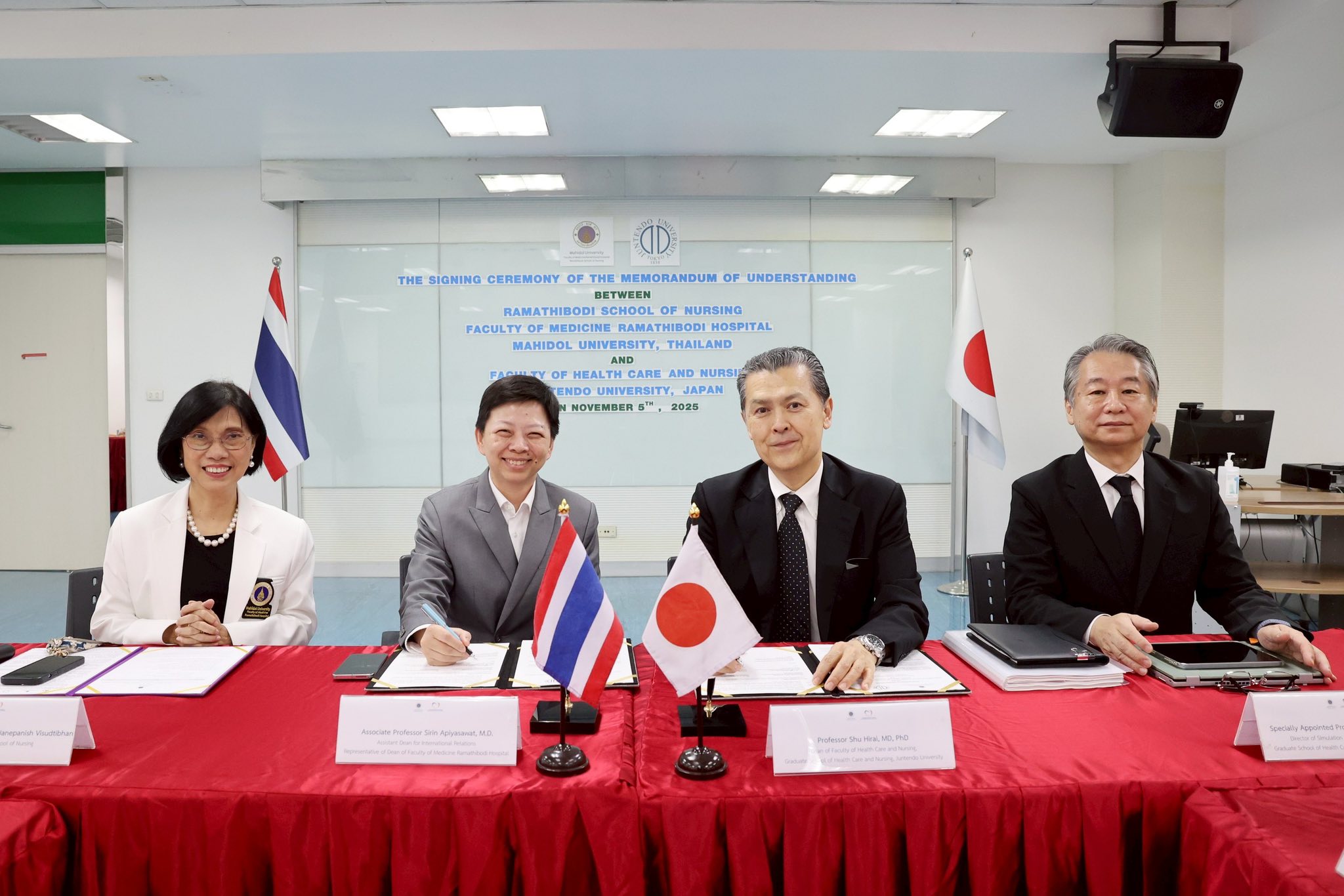 วันที่ 5 พฤศจิกายน 2568 รองศาสตราจารย์ ดร.พูลสุข เจนพานิชย์ วิสุทธิพันธ์ ผู้อำนวยการโรงเรียนพยาบาลรามาธิบดี คณะแพทยศาสตร์โรงพยาบาลรามาธิบดี มหาวิทยาลัยมหิดล พร้อมด้วย Professor Shu Hirai, MD, PhD, Dean, Faculty of Health Care and Nursing, Juntendo University ประเทศญี่ปุ่น ร่วมลงนามบันทึกข้อตกลงความร่วมมือทางวิชาการ (MOU) ในโอกาสนี้ ได้รับเกียรติจาก รองศาสตราจารย์ แพทย์หญิงสิรินทร์ อภิญาสวัสดิ์ ผู้ช่วยคณบดีฝ่ายวิเทศสัมพันธ์ ผู้แทนคณบดีคณะแพทยศาสตร์โรงพยาบาลรามาธิบดี มหาวิทยาลัยมหิดล เป็นประธานในพิธี