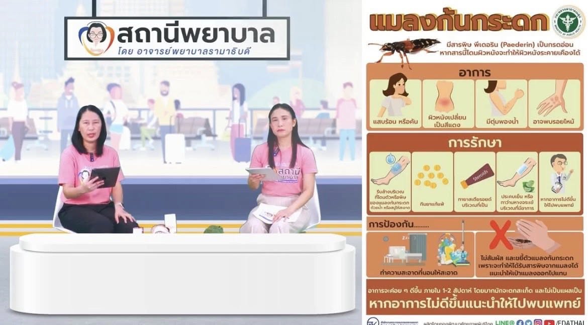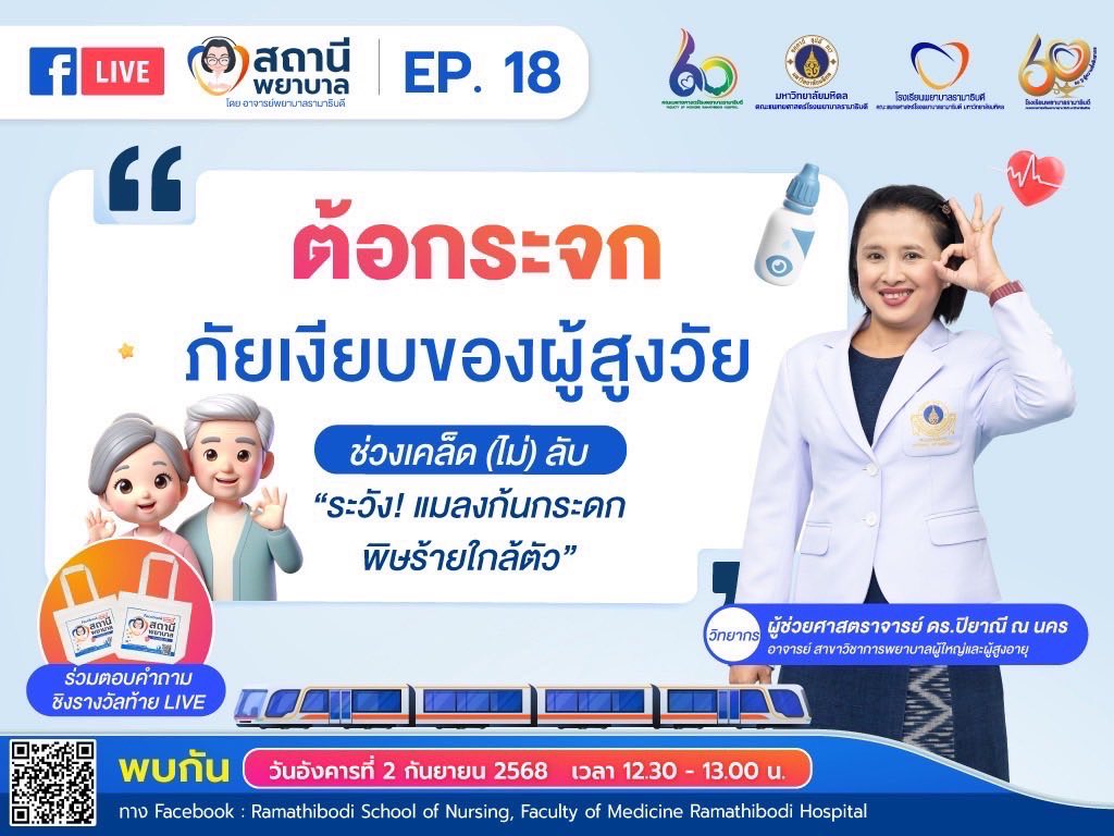 วันที่ 2 กันยายน 2568 โรงเรียนพยาบาลรามาธิบดี คณะแพทยศาสตร์โรงพยาบาลรามาธิบดี มหาวิทยาลัยมหิดล จัดรายการ “สถานีพยาบาล” EP18 “ต้อกระจก: ภัยเงียบของผู้สูงวัย” โดยมี ผู้ช่วยศาสตราจารย์ ดร.ปิยาณี ณ นคร อาจารย์ สาขาวิชาการพยาบาลผู้ใหญ่และผู้สูงอายุ โรงเรียนพยาบาลรามาธิบดี คณะแพทยศาสตร์โรงพยาบาลรามาธิบดี มหาวิทยาลัยมหิดล ร่วมเป็นวิทยากรในรายการ และช่วง “คุยกับพยาบาล” “ถามมา-ตอบไป” “เคล็ด (ไม่) ลับ..ฉบับพยาบาล” เรื่อง "ระวัง! แมลงก้นกระดก พิษร้ายใกล้ตัว" ดำเนินรายการโดย อาจารย์ ดร.ปิยวดี ทองยศ ผู้ช่วยผู้อำนวยการโรงเรียนพยาบาลรามาธิบดี ด้านสื่อสารองค์กร อาจารย์ สาขาวิชาการพยาบาลผู้ใหญ่และผู้สูงอายุ และอาจารย์ ศิริพร นิราพันธ์ อาจารย์ สาขาวิชาการพยาบาลเด็ก โรงเรียนพยาบาลรามาธิบดี ถ่ายทอดสดผ่าน Facebook Live: Ramathibodi School of Nursing, Faculty of Medicine Ramathibodi Hospital
