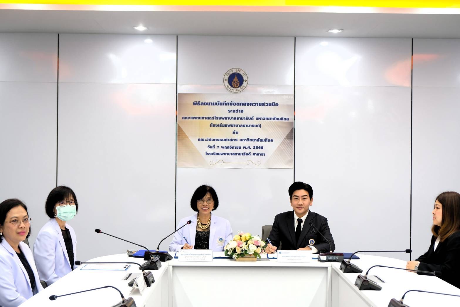 วันที่ 7 พฤศจิกายน 2568 รองศาสตราจารย์ ดร.พูลสุข เจนพานิชย์ วิสุทธิพันธ์ ผู้อำนวยการโรงเรียนพยาบาลรามาธิบดี คณะแพทยศาสตร์โรงพยาบาลรามาธิบดี มหาวิทยาลัยมหิดล พร้อมด้วย รองศาสตราจารย์ ดร.ธนภัทร์ วานิชานนท์ คณบดีคณะวิศวกรรมศาสตร์ มหาวิทยาลัยมหิดล ร่วมลงนามบันทึกข้อตกลงความร่วมมือทางวิชาการ (MOU) ระหว่าง โรงเรียนพยาบาลรามาธิบดี คณะแพทยศาสตร์โรงพยาบาลรามาธิบดี กับ คณะวิศวกรรมศาสตร์ มหาวิทยาลัยมหิดล โดยมี ผู้บริหารทั้งสองฝ่ายร่วมเป็นสักขีพยาน ซึ่งทั้งสองฝ่ายจะร่วมกันส่งเสริม สนับสนุน พัฒนาและดำเนินการวิจัยร่วมกัน ให้เกิดความเข้มแข็ง โดยบูรณาการผสมผสานศาสตร์ทางการพยาบาลและเทคโนโลยี ในการคิดค้น สร้างสรรค์ และพัฒนานวัตกรรมด้านสุขภาพที่เป็นประโยชน์ต่อสังคมต่อไป