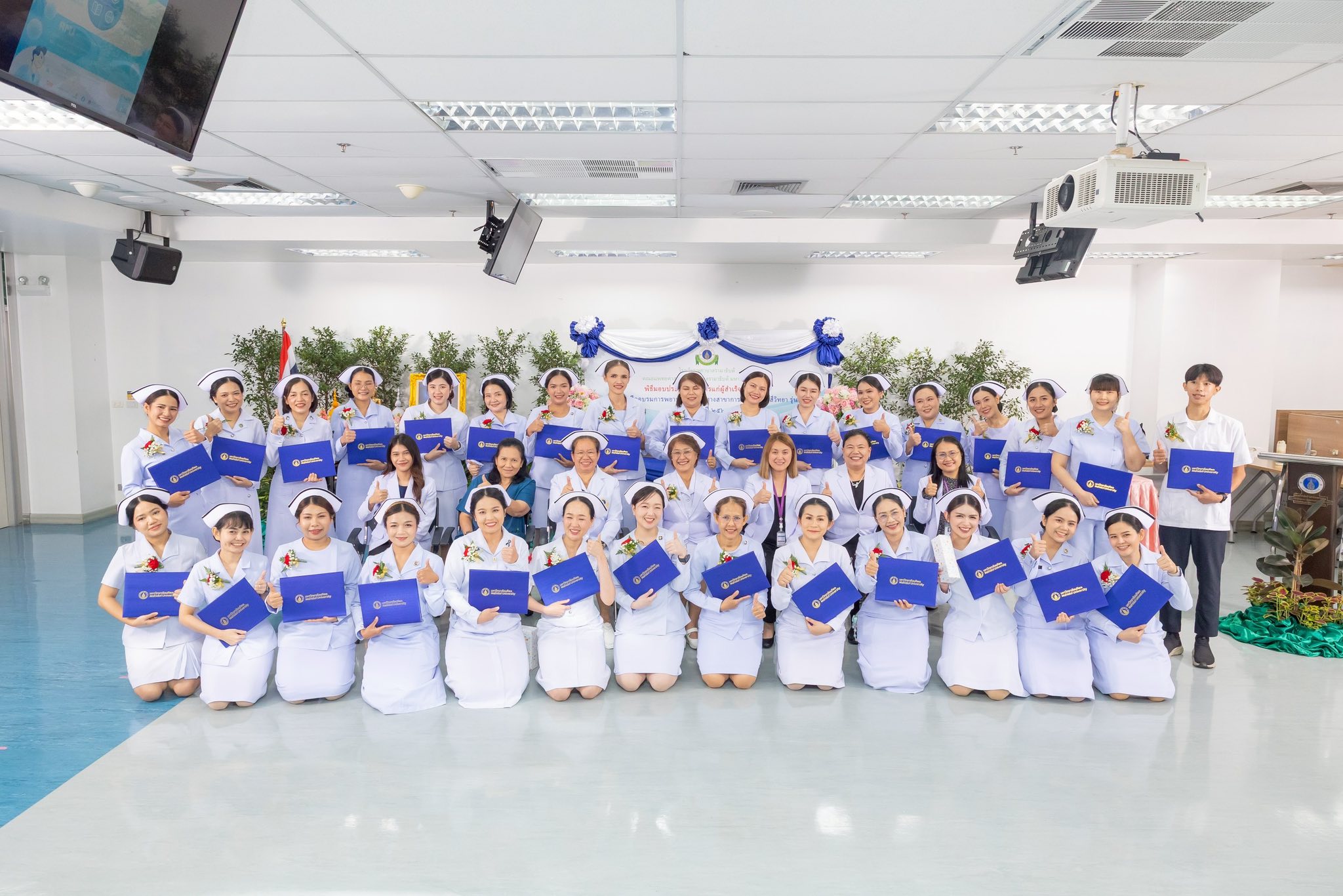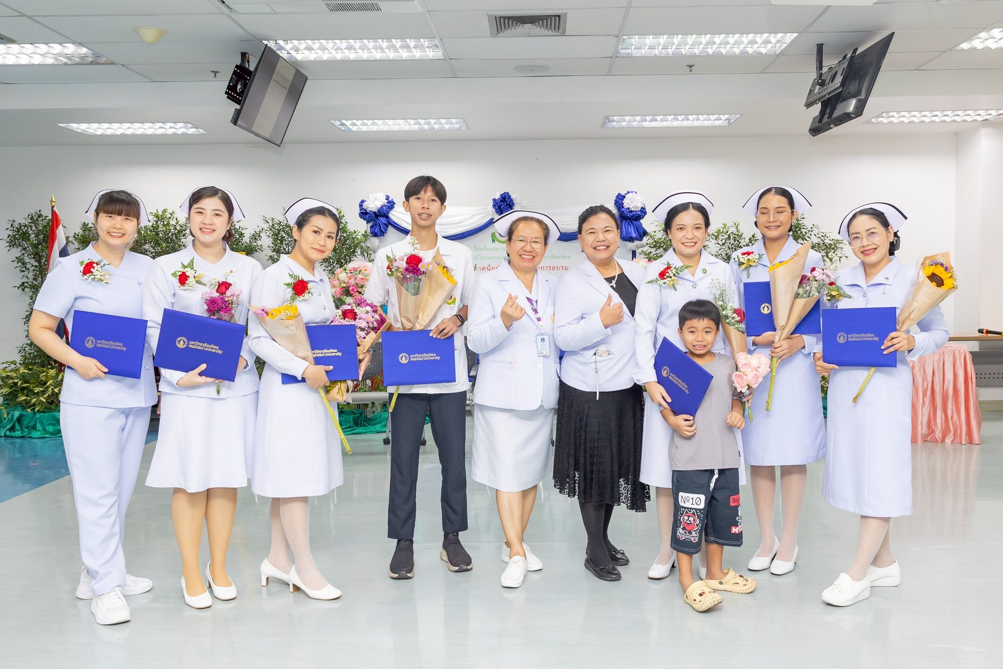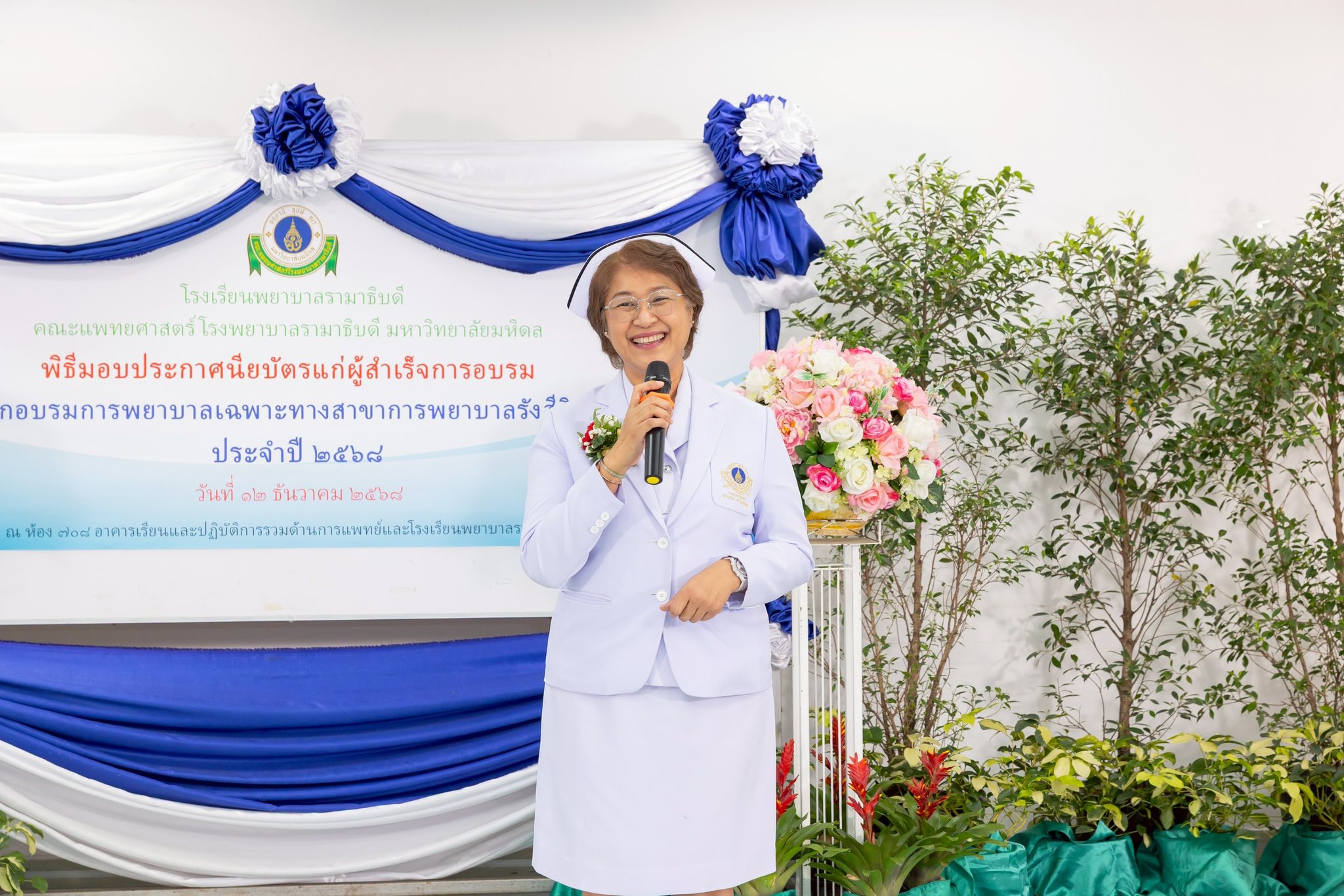 วันที่ 12 ธันวาคม 2568 รองศาสตราจารย์ ดร.สุชิรา ชัยวิบูลย์ธรรม รองผู้อำนวยการฯ ฝ่ายบริหาร ผู้แทนผู้อำนวยการโรงเรียนพยาบาลรามาธิบดี คณะแพทยศาสตร์โรงพยาบาลรามาธิบดี มหาวิทยาลัยมหิดล เป็นประธานในพิธีจุดธูปเทียนบูชาพระรัตนตรัยพร้อมกล่าวให้โอวาทและมอบประกาศนียบัตร แก่ ผู้ที่สำเร็จการอบรม “หลักสูตรฝึกอบรมการพยาบาลเฉพาะทางสาขาการพยาบาลรังสีวิทยา” รุ่นที่ 9 จำนวน 36 คน และมอบรางวัลแก่ผู้ที่ได้รับคะแนนผลการเรียนยอดเยี่ยม โดยมี ผู้ช่วยศาสตราจารย์ ดร.อัษฎาพร นิยมญาติ ผู้ช่วยผู้อำนวยการฯ ด้านบริการวิชาการ และประธานหลักสูตรฝึกอบรมการพยาบาลเฉพาะทาง กล่าวรายงาน พร้อมด้วย รองศาสตราจารย์ ดร.บัวหลวง สำแดงฤทธิ์ ประธานหลักสูตรฝึกอบรมการพยาบาลเฉพาะทางสาขาการพยาบาลรังสีวิทยา ขานรายนามผู้สำเร็จการอบรม และผู้ช่วยศาสตราจารย์ ดร.ธิราภรณ์ จันทร์ดา อาจารย์ สาขาวิชาการพยาบาลผู้ใหญ่และผู้สูงอายุ ให้เกียรติเป็นพิธีกร
