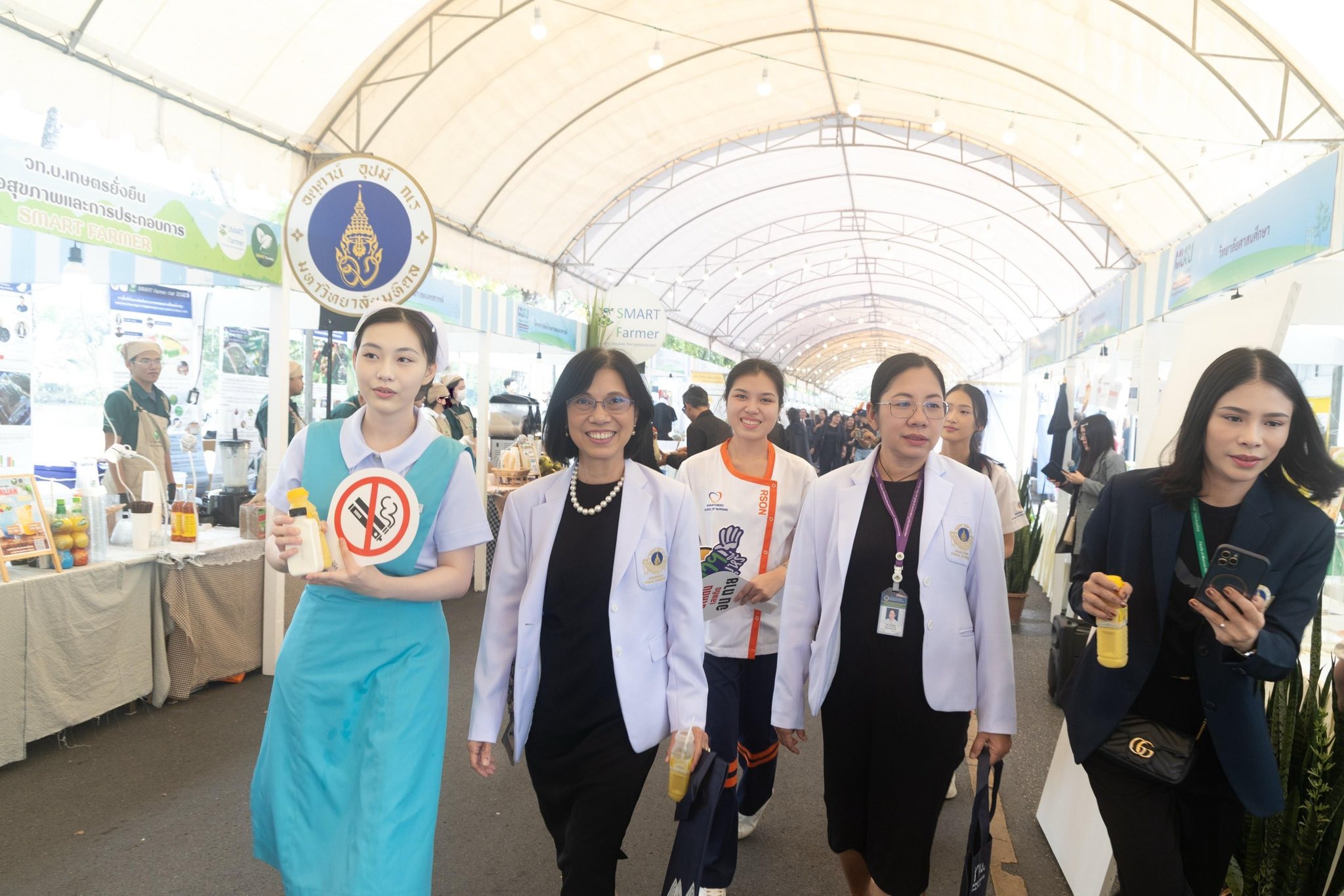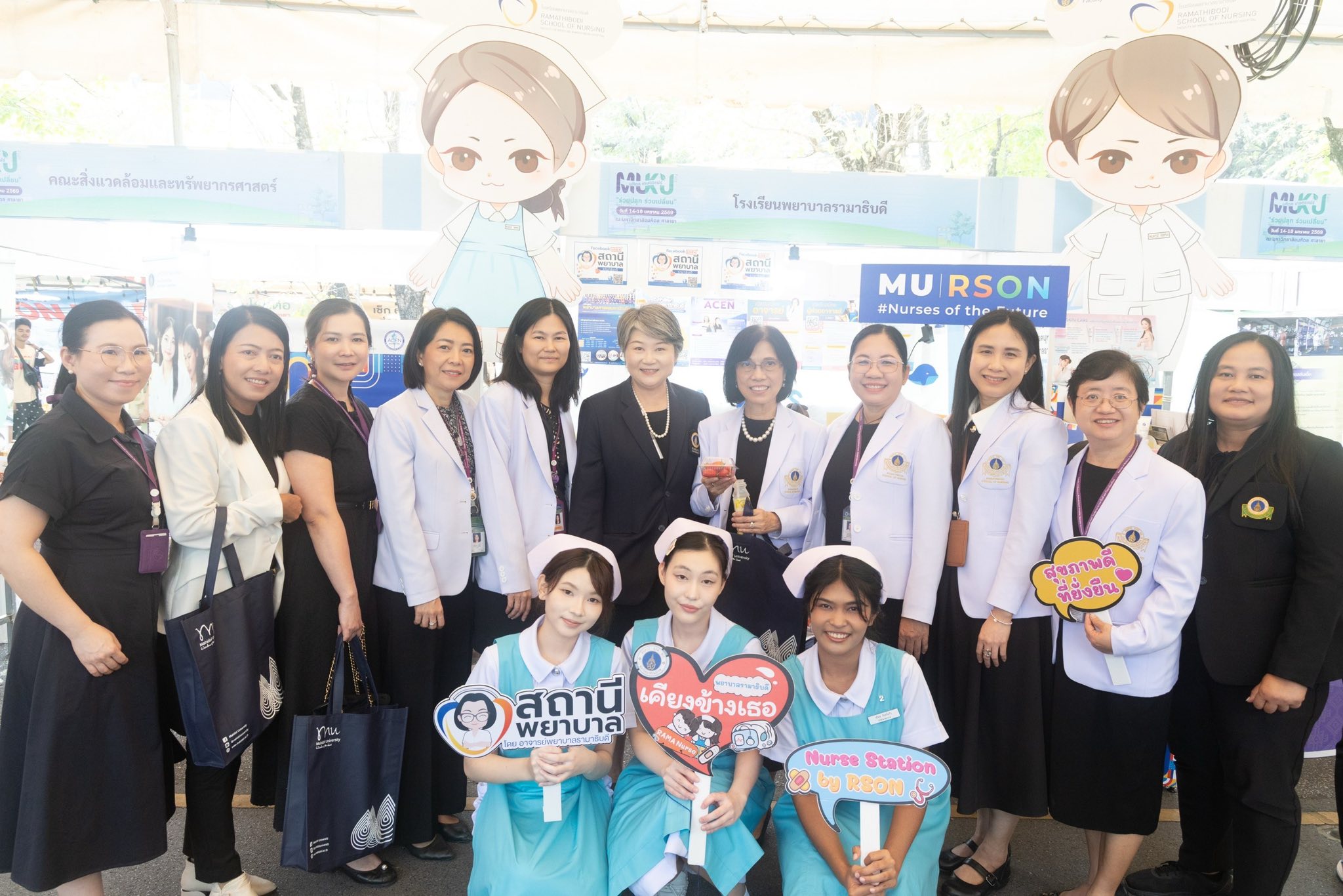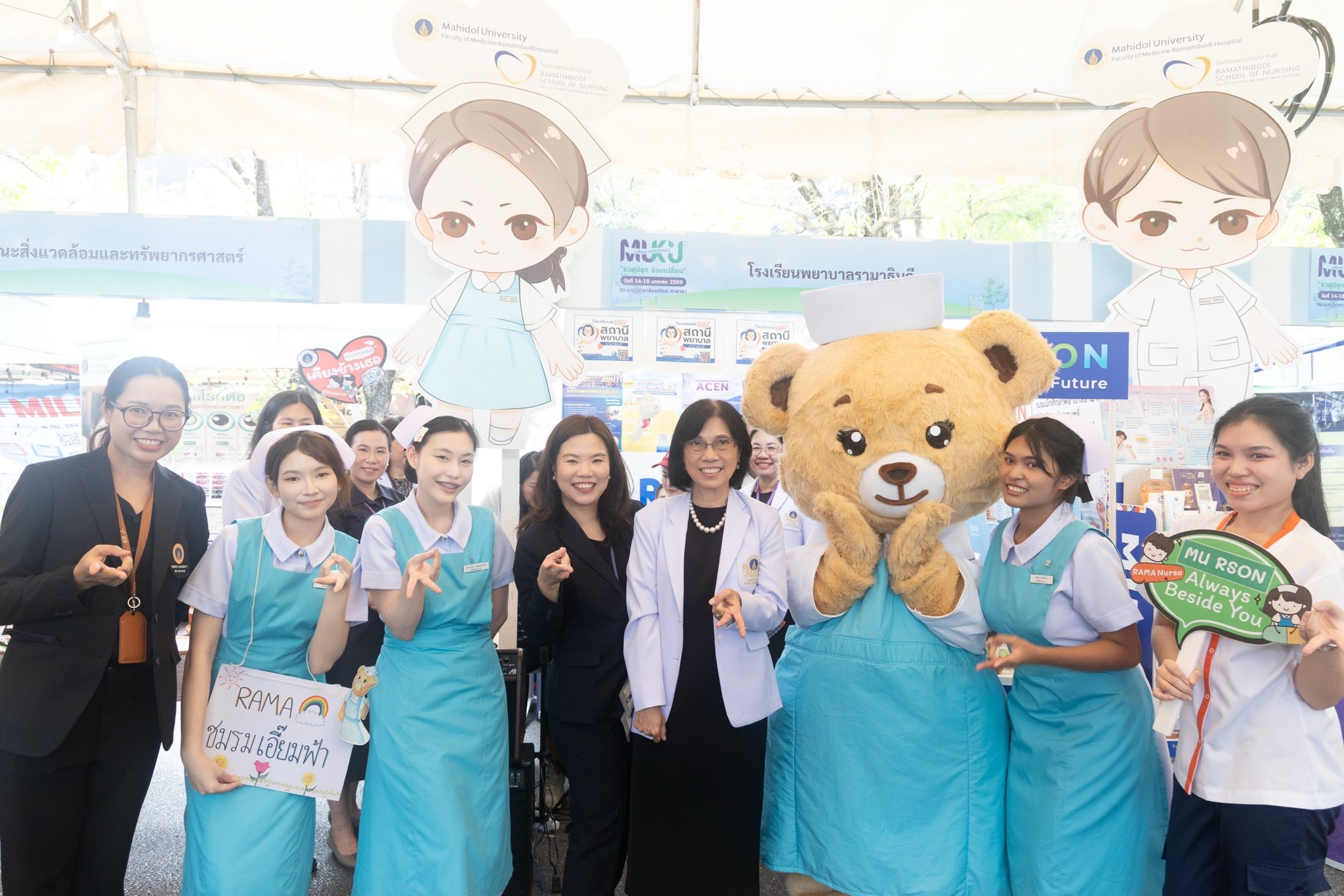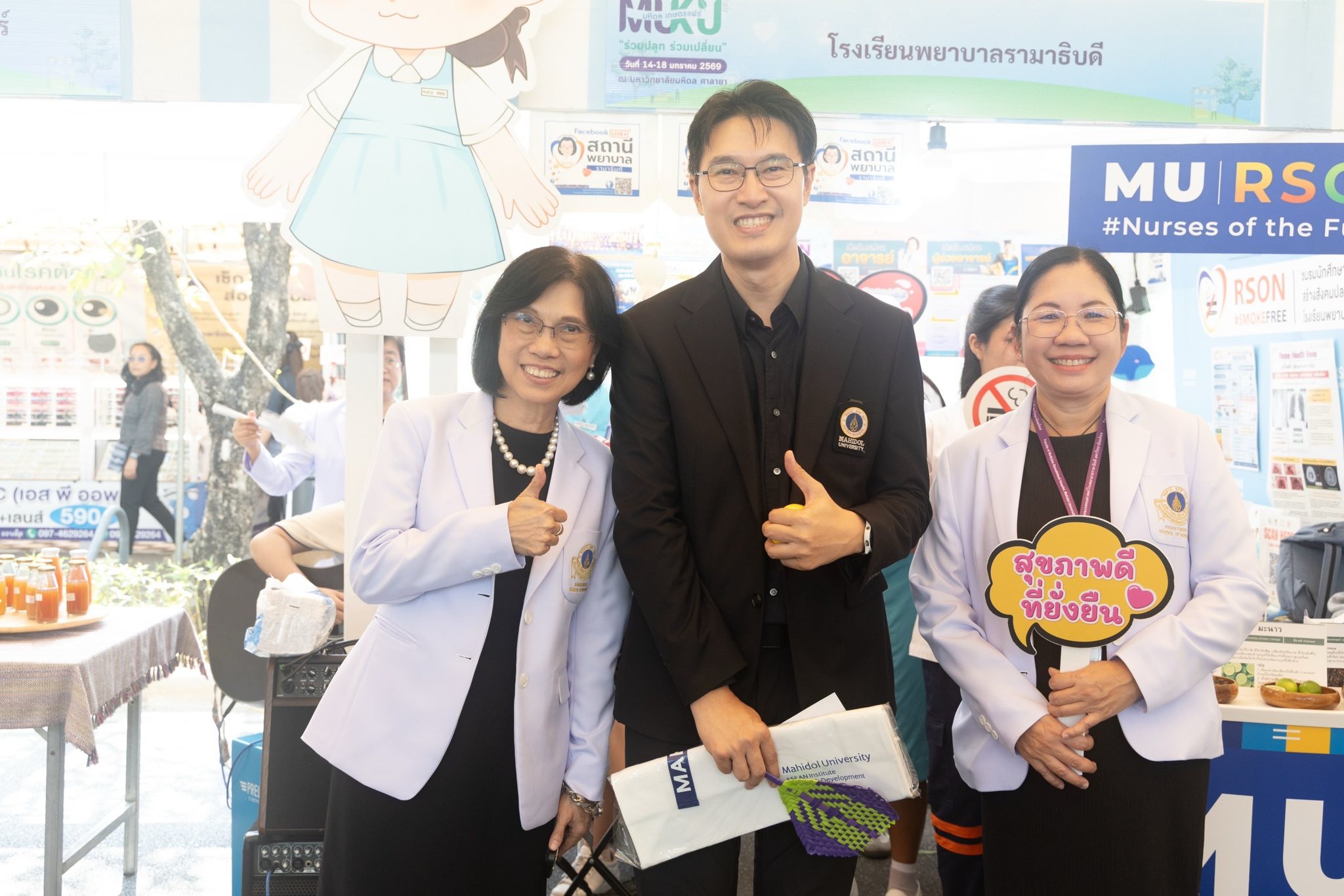 วันที่ 14 มกราคม 2569 รองศาสตราจารย์ ดร.พูลสุข เจนพานิชย์ วิสุทธิพันธ์ ผู้อำนวยการโรงเรียนพยาบาลรามาธิบดี คณะแพทยศาสตร์โรงพยาบาลรามาธิบดี มหาวิทยาลัยมหิดล พร้อมด้วย ผู้ช่วยศาสตราจารย์ ดร.จำปี เกรนเจอร์ รองผู้อำนวยการฯ ฝ่ายวิจัยและนวัตกรรมทางการพยาบาล ผู้ช่วยศาสตราจารย์ ดร.องุ่น น้อยอุดม ผู้ช่วยผู้อำนวยการฯ ด้านกิจการนักศึกษา คณะผู้บริหาร และคณาจารย์โรงเรียนพยาบาลรามาธิบดี เข้าร่วมพิธีเปิดงาน “มหิดล-เกษตรแฟร์ 2569” ภายใต้แนวคิด “ร่วมปลูก ร่วมเปลี่ยน” ขับเคลื่อน Health Ecosystem สู่สังคมคาร์บอนต่ำอย่างยั่งยืน