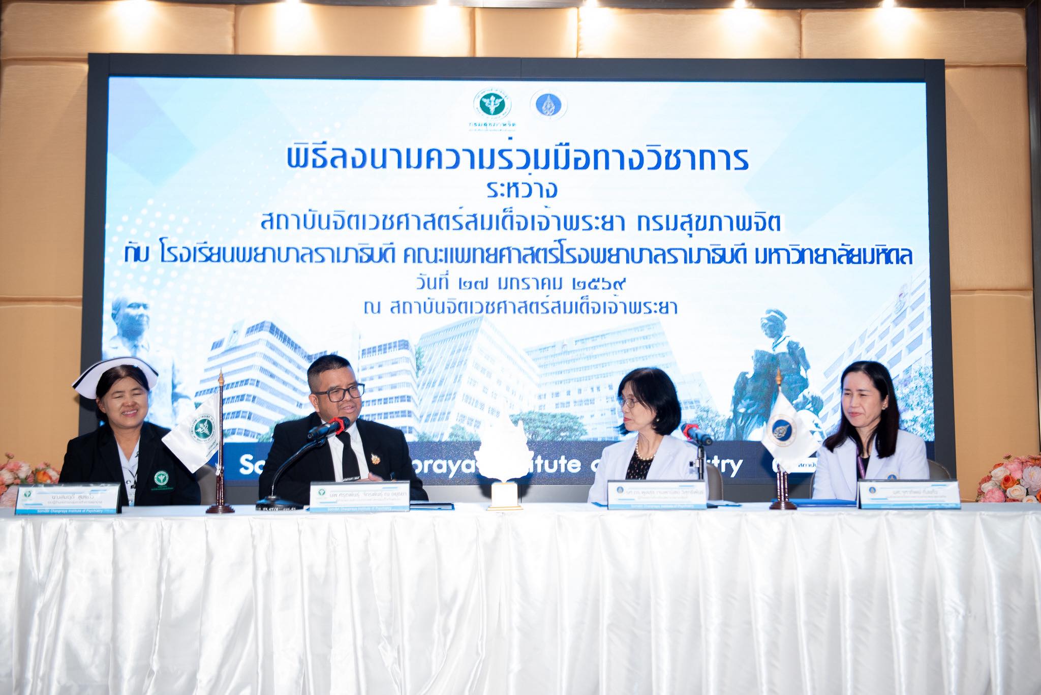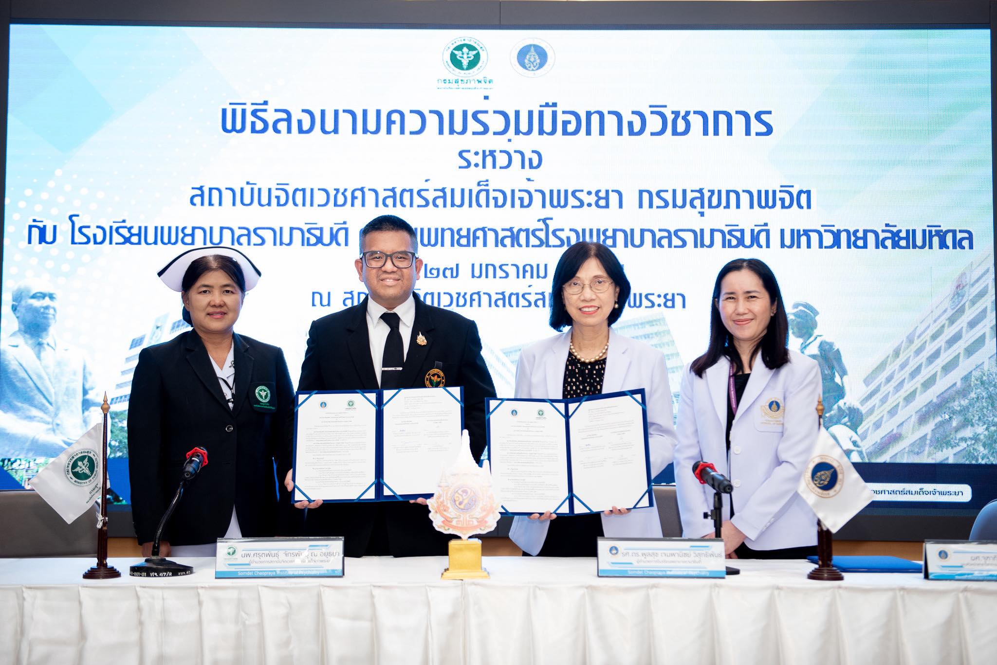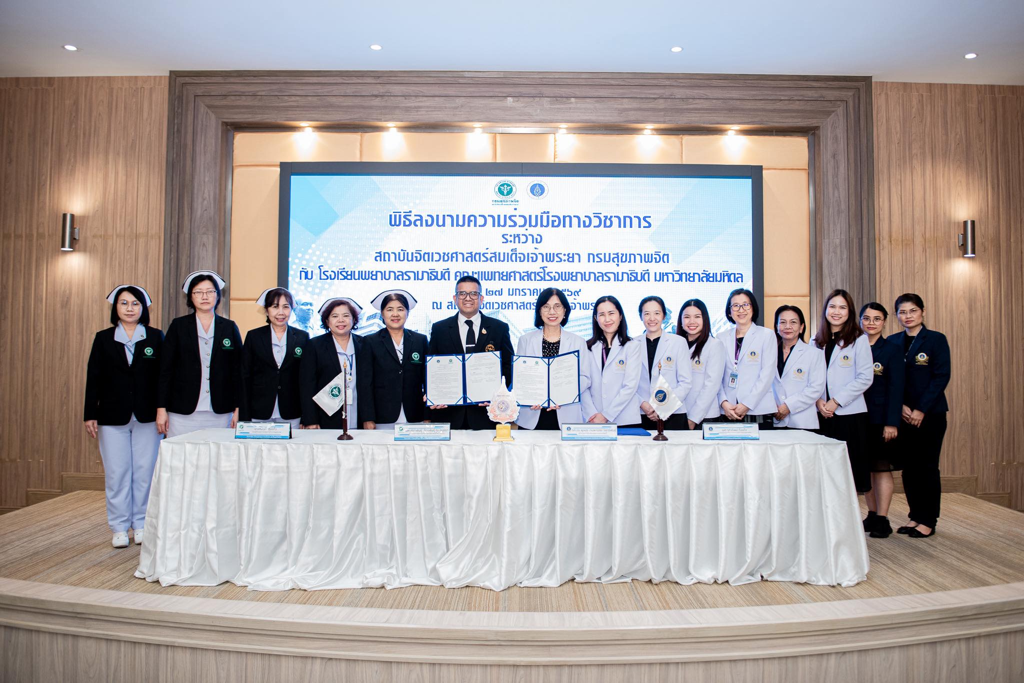วันที่ 27 มกราคม 2569 รองศาสตราจารย์ ดร.พูลสุข เจนพานิชย์ วิสุทธิพันธ์ ผู้อำนวยการโรงเรียนพยาบาลรามาธิบดี คณะแพทยศาสตร์โรงพยาบาลรามาธิบดี มหาวิทยาลัยมหิดล พร้อมด้วย นายแพทย์ศรุตพันธุ์ จักรพันธุ์ ณ อยุธยา ผู้อำนวยการสถาบันจิตเวชศาสตร์สมเด็จเจ้าพระยา กรมสุขภาพจิต ได้ร่วมลงนามบันทึกข้อตกลงความร่วมมือทางวิชาการ (MOU) ระหว่าง โรงเรียนพยาบาลรามาธิบดี คณะแพทยศาสตร์โรงพยาบาลรามาธิบดี มหาวิทยาลัยมหิดล กับ สถาบันจิตเวชศาสตร์สมเด็จเจ้าพระยา กรมสุขภาพจิต ซึ่งมีผู้บริหารทั้งสองฝ่าย คณาจารย์และบุคลากร ร่วมเป็นสักขีพยาน ความร่วมมือในครั้งนี้เป็นความร่วมมือที่ต่อเนื่องมายาวนาน โดยมีวัตถุประสงค์เพื่อสนับสนุนการเรียนการสอนในคลินิกของนักศึกษา การส่งเสริมให้เกิดการพัฒนาศักยภาพบุคลากร ตลอดจนการแลกเปลี่ยนองค์ความรู้ ที่จะนำไปสู่การพัฒนาคุณภาพผู้เรียน บุคลากร และการบริการสุขภาพจิตแก่ประชาชนอย่างยั่งยืนต่อไป