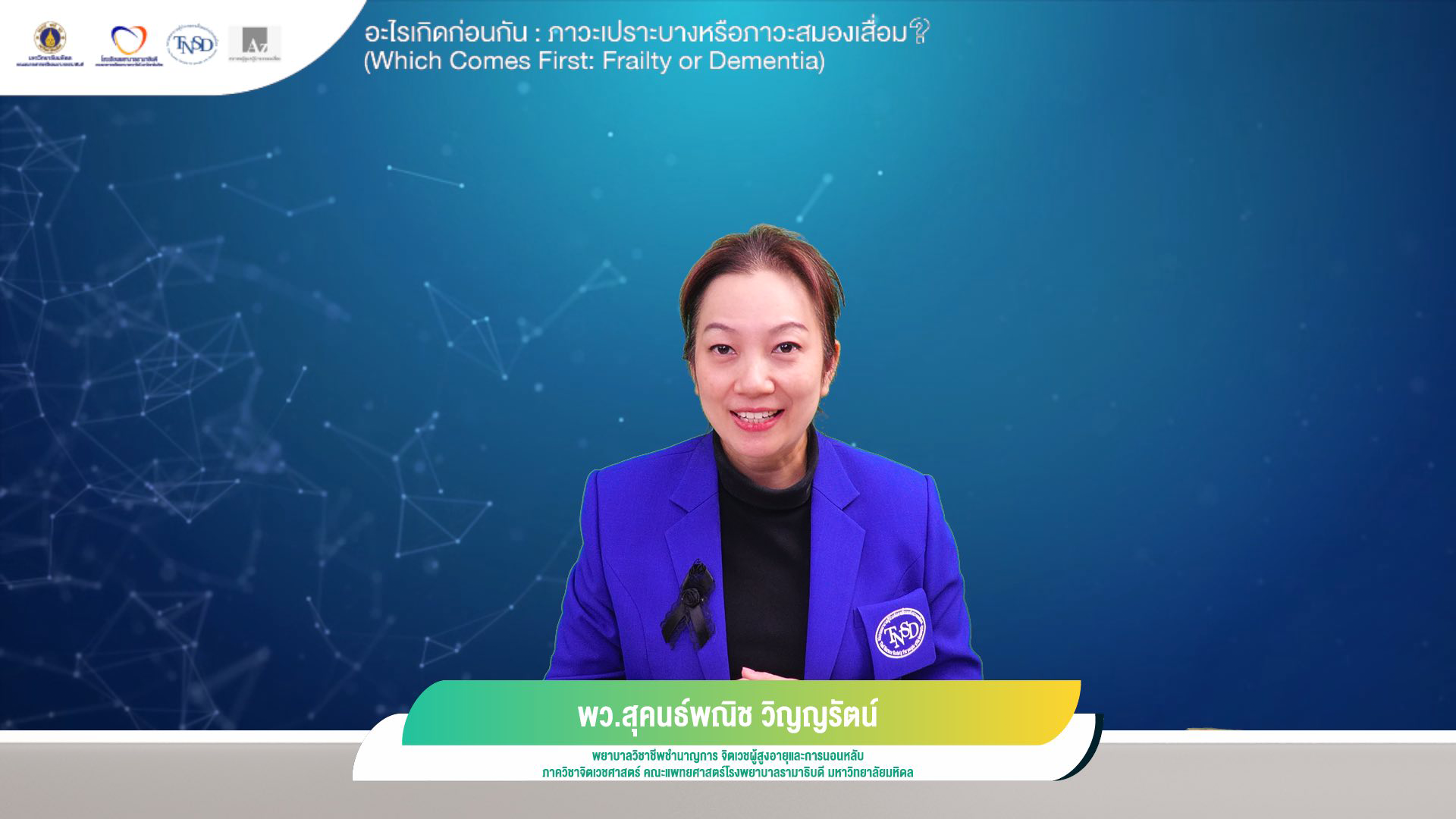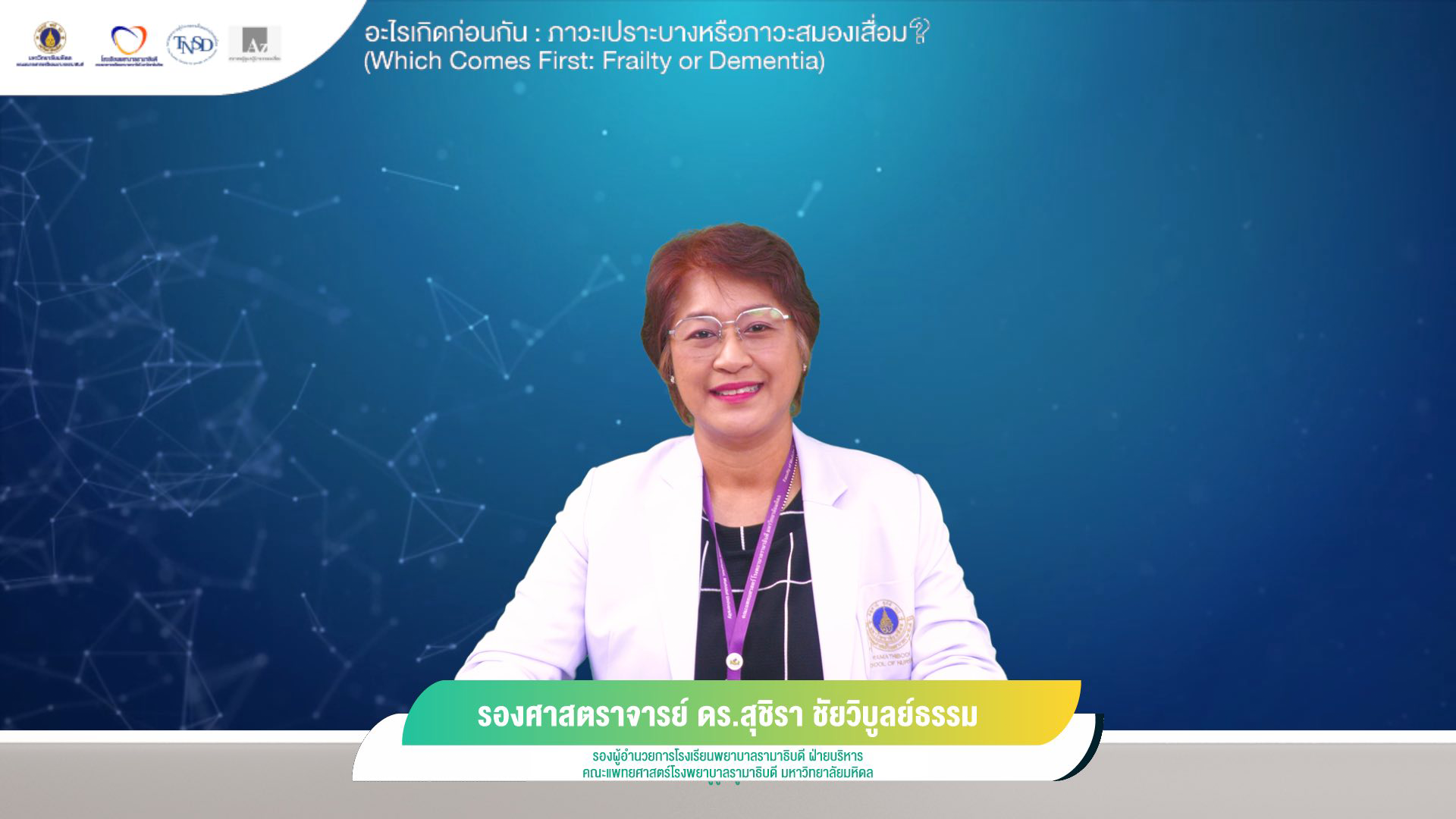 โรงเรียนพยาบาลรามาธิบดี คณะแพทยศาสตร์โรงพยาบาลรามาธิบดี มหาวิทยาลัยมหิดล ร่วมกับ ชมรมพยาบาลผู้ป่วยสมองเสื่อมแห่งประเทศไทย และสมาคมผู้ดูแลผู้ป่วยสมองเสื่อม จัดการประชุมวิชาการออนไลน์เรื่อง “อะไรเกิดก่อนกันภาวะเปราะบาง หรือ ภาวะสมองเสื่อม? WHICH COMES FIRST: FRAILTY OR DEMENTIA ผ่านระบบออนไลน์ Zoom meeting