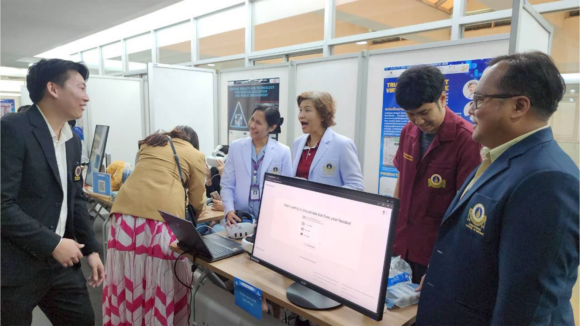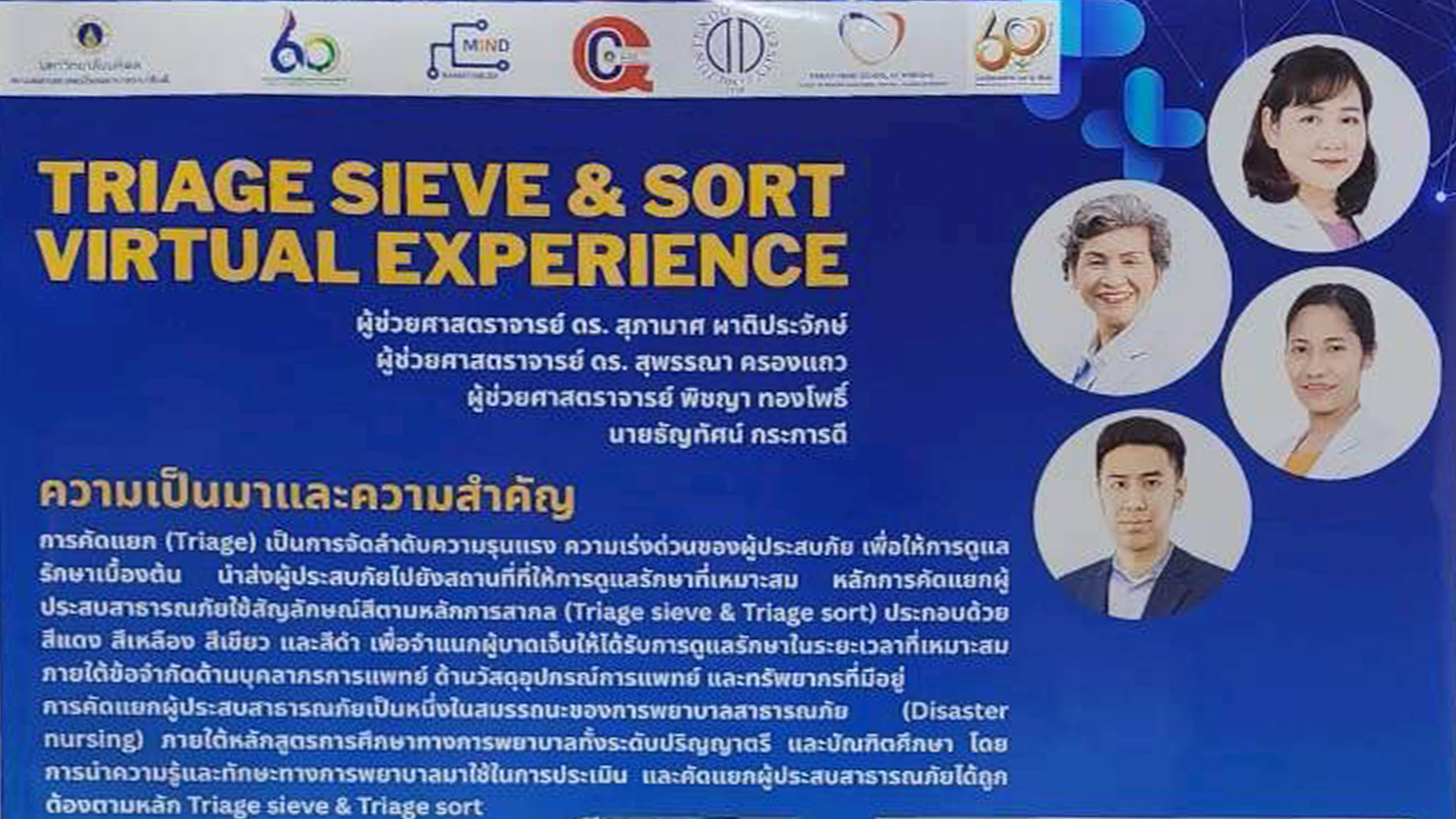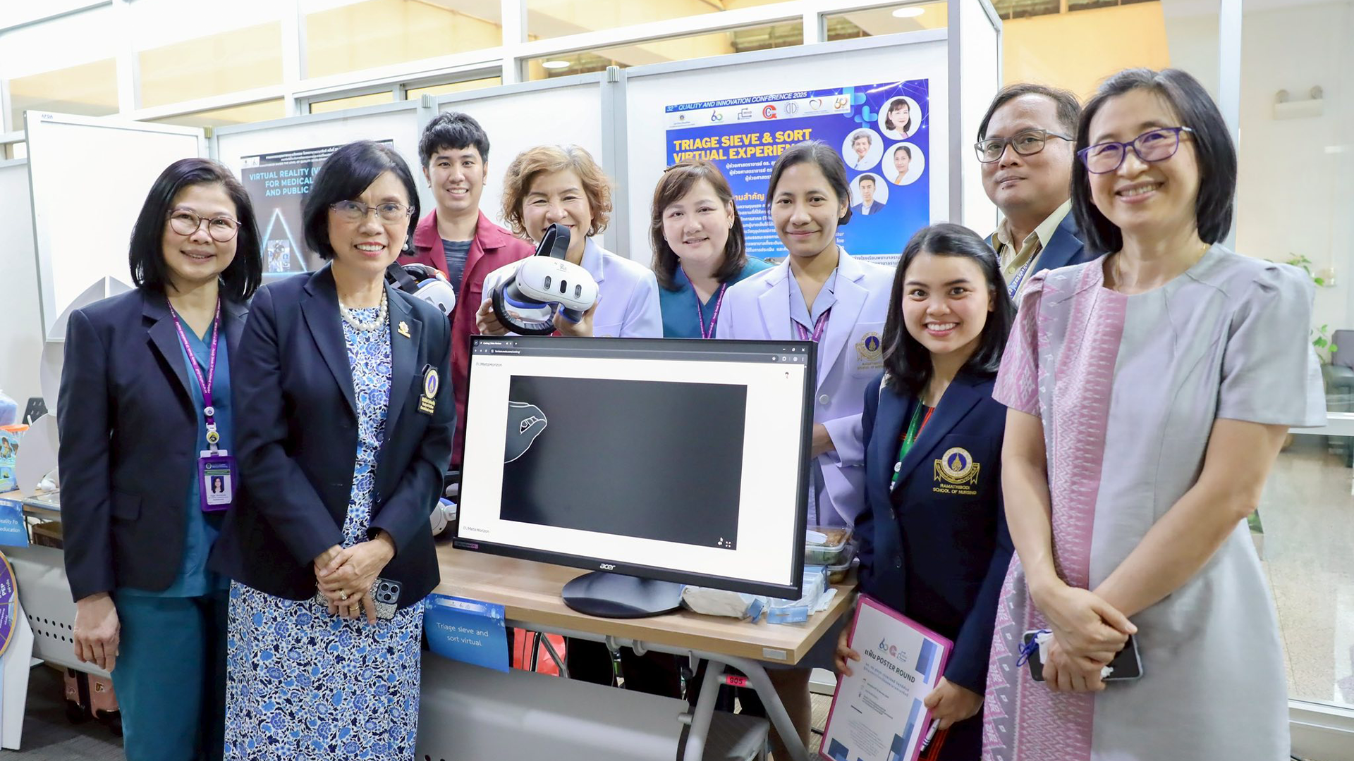 ภายในงาน โรงเรียนพยาบาลรามาธิบดี ร่วมจัดแสดงนิทรรศการผลงานด้านคุณภาพและนวัตกรรม เรื่อง “TRIAGE SIEVE & SORT VIRTUAL EXPERIENCE” โดยมี ผู้ช่วยศาสตราจารย์ ดร.สุภามาศ ผาติประจักษ์ อาจารย์ สาขาวิชาการพยาบาลสุขภาพชุมชน ผู้ช่วยศาสตราจารย์ ดร.สุพรรณา ครองแถว ผู้ช่วยผู้อำนวยการฯ ด้านเทคโนโลยีดิจิทัลและสารสนเทศ ผู้ช่วยศาสตราจารย์ พิชญา ทองโพธิ์ นายกสมาคมศิษย์เก่าพยาบาลรามาธิบดี และอาจารย์ สาขาวิชาการพยาบาลผู้ใหญ่และผู้สูงอายุ นายธัญทัศน์ กระการดี นักวิชาการโสตทัศนศึกษา ดร.มงคล แปลงกาย เจ้าหน้าที่ระบบงานคอมพิวเตอร์ เข้าร่วมนำเสนอผลงานในการพัฒนาการเรียนการสอนด้วยเทคโนโลยีเสมือนจริง