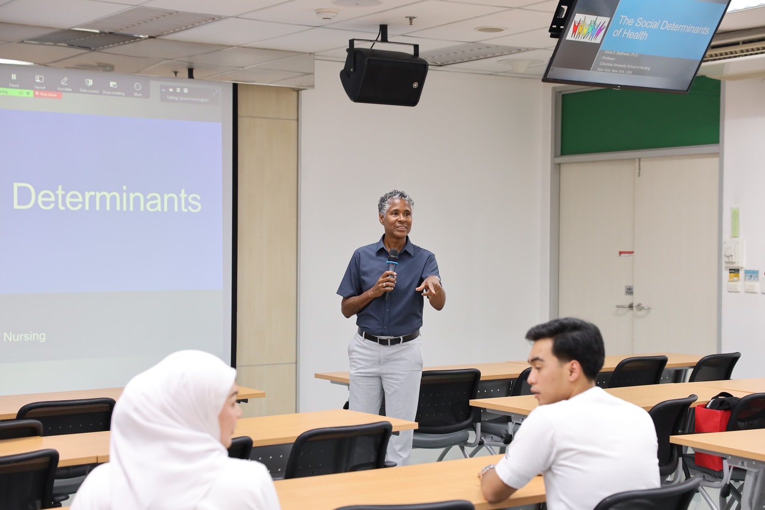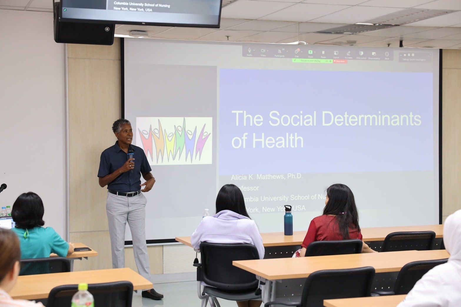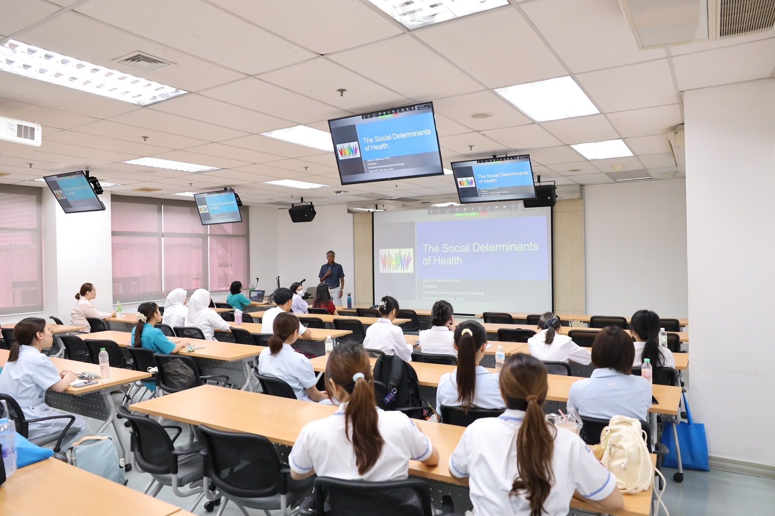 ในโอกาสนี้ นักวิชาการอาคันตุกะ Prof. Alicia K. Matthews, PhD, MS, BS, LCP, Professor of Behavioral Sciences (in Nursing) จาก Columbia University School of Nursing มหาวิทยาลัยโคลัมเบีย กรุงนิวยอร์ก ประเทศสหรัฐอเมริกา ให้เกียรติเป็นวิทยากรบรรยาย โดยมี คณาจารย์โรงเรียนพยาบาลรามาธิบดี นักศึกษาในโครงการแลกเปลี่ยน นักศึกษาระดับปริญญาตรี นักศึกษาระดับบัณฑิตศึกษา และฝ่ายการพยาบาล โรงพยาบาลรามาธิบดี เข้าร่วมรับฟังการบรรยายในครั้งนี้