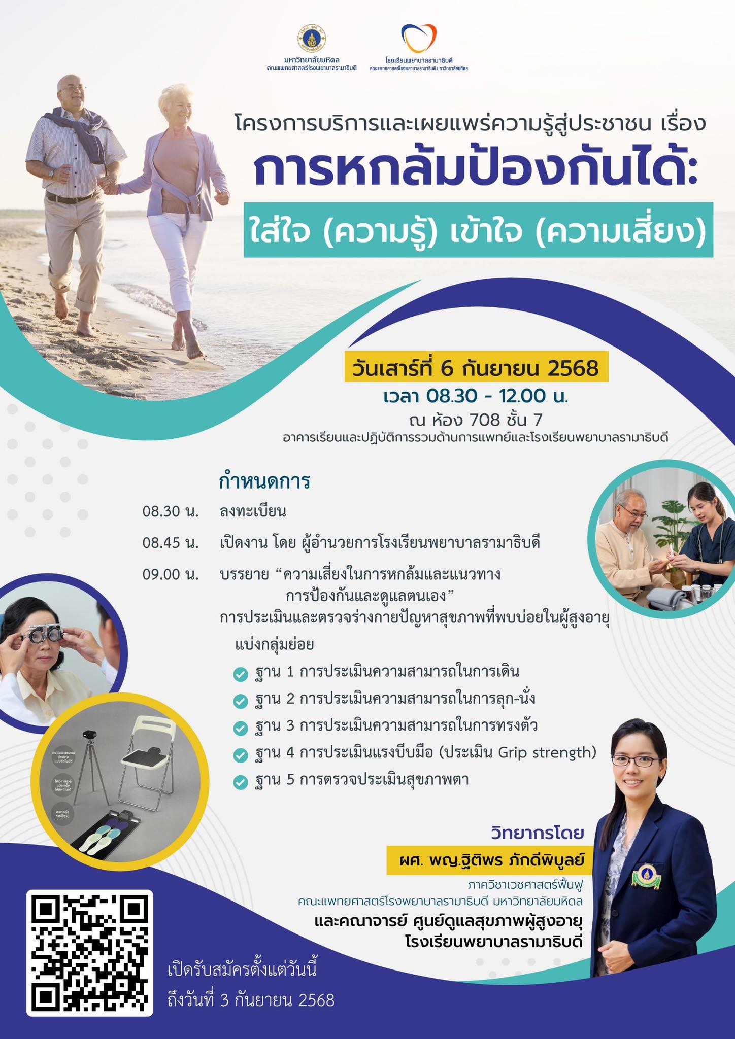 📣 ขอเชิญชวนทุกท่านเข้าร่วมโครงการบริการและเผยแพร่ความรู้สู่ประชาชน เรื่อง “การหกล้มป้องกันได้: ใส่ใจ (ความรู้) เข้าใจ (ความเสี่ยง)”