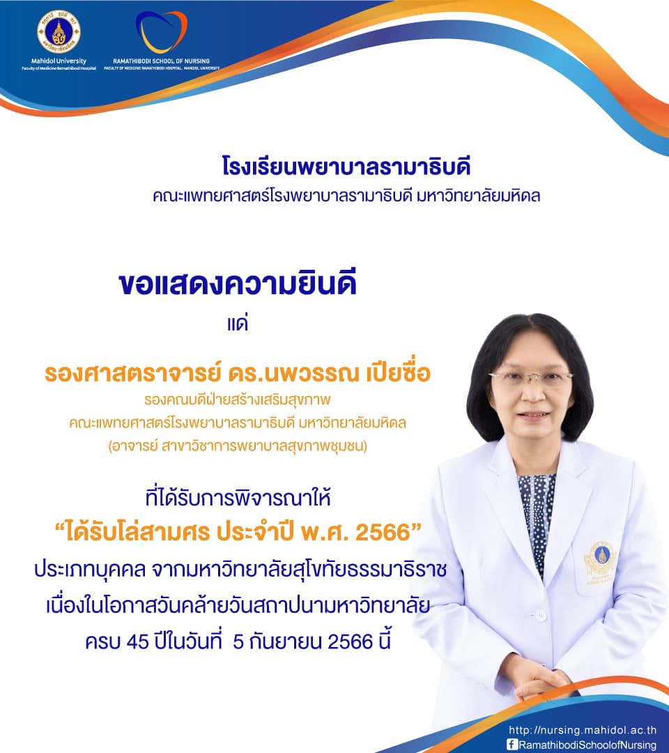 ขอแสดงความยินดี กับ รองศาตราจารย์ ดร.นพวรรณ เปียซื่อ รองคณบดีฝ่ายสร้างเสริมสุขภาพ คณะแพทยศาสตร์โรงพยาบาลรามาธิบดี มหาวิทยาลัยมหิดล และอาจารย์พยาบาล สาขาวิชาการพยาบาลสุขภาพชุมชน โรงเรียนพยาบาลรามาธิบดี คณะแพทยศาสตร์โรงพยาบาลรามาธิบดี มหาวิทยาลัยมหิดล ที่ได้รับการพิจารณาให้ ได้รับโล่สามศร ประจำปี 2566 ประเภทบุคคล จากมหาวิทยาลัยสุโขทัยธรรมาธิราช
