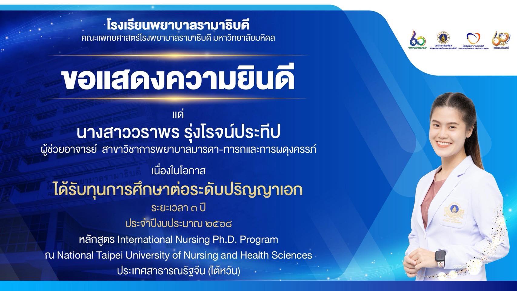 ขอแสดงความยินดี แด่ นางสาววราพร รุ่งโรจน์ประทีป ผู้ช่วยอาจารย์ สาขาวิชาการพยาบาลมารดา-ทารกและการผดุงครรภ์