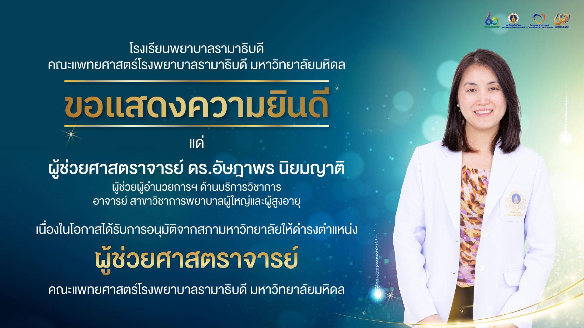 ขอแสดงความยินดี แด่ ผู้ช่วยศาสตราจารย์ ดร.อัษฎาพร นิยมญาติ ผู้ช่วยผู้อำนวยการโรงเรียนพยาบาลรามาธิบดี ด้านบริการวิชาการ และอาจารย์ สาขาวิชาการพยาบาลผู้ใหญ่และผู้สูงอายุ