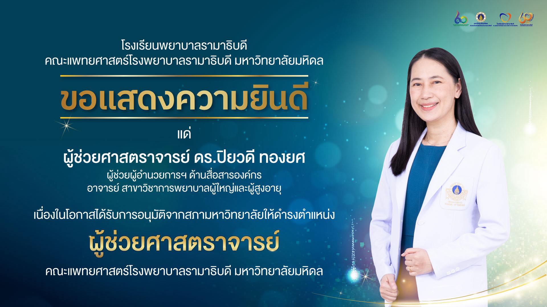 ขอแสดงความยินดี แด่ ผู้ช่วยศาสตราจารย์ ดร.ปิยวดี ทองยศ ผู้ช่วยผู้อำนวยการโรงเรียนพยาบาลรามาธิบดี ด้านสื่อสารองค์กร และอาจารย์ สาขาวิชาการพยาบาลผู้ใหญ่และผู้สูงอายุ