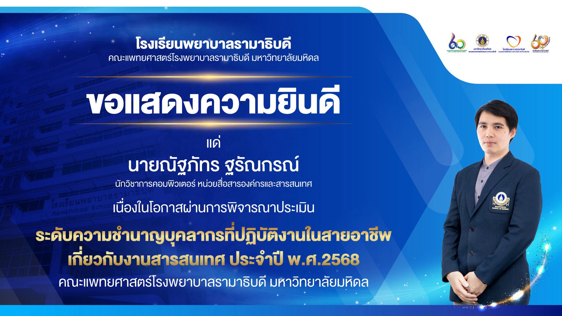 เนื่องในโอกาสที่ ผ่านการพิจารณาประเมิน ระดับ ความชำนาญบุคลากรที่ปฏิบัติงานในสายอาชีพเกี่ยวกับงานสารสนเทศ ประจำปี พ.ศ.2568 คณะแพทยศาสตร์โรงพยาบาลรามาธิบดี มหาวิทยาลัยมหิดล