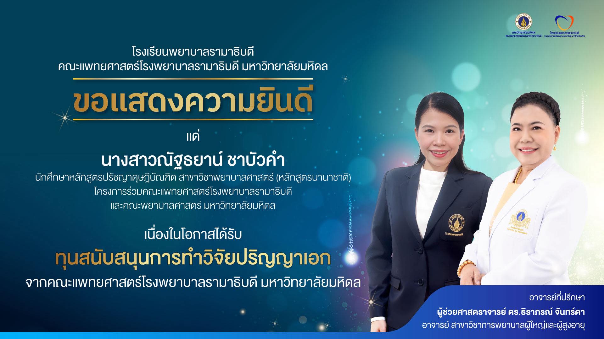 ขอแสดงความยินดี แก่ นางสาวณัฐธยาน์ ชาบัวคำ นักศึกษาหลักสูตรปรัชญาดุษฎีบัณฑิต สาขาวิชาพยาบาลศาสตร์ (หลักสูตรนานาชาติ)