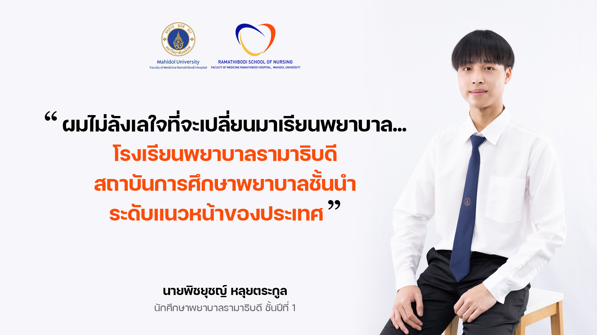 นายพิชยุชญ์ หลุยตระกูล นักศึกษาพยาบาลรามาธิบดี ชั้นปีที่ 1 จากโรงเรียนพยาบาลรามาธิบดี คณะแพทยศาสตร์โรงพยาบาลรามาธิบดี มหาวิทยาลัยมหิดล ที่ตัดสินใจย้ายมาเรียนพยาบาลในรั้วรามาธิบดี เพราะแรงผลักดันในใจเมื่อวัยเด็ก