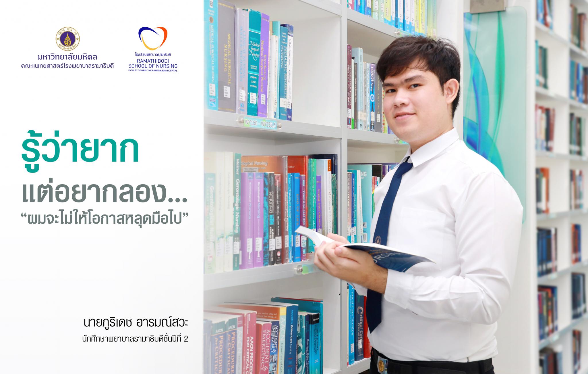 ทำไมถึงเลือกเรียน พยาบาลรามาธิบดี น้องโดม นายภูริเดช อารมณ์สวะ อายุ 20 ปี นักศึกษาพยาบาลรามาธิบดีชั้นปีที่ 2 จากโรงเรียนพยาบาลรามาธิบดี คณะแพทยศาสตร์โรงพยาบาลรามาธิบดี มหาวิทยาลัยมหิดล ประธานนักศึกษาพยาบาลชั้นปีที่ 2 และผู้เข้าร่วมโครงการ Mahidol University International Relations (MU-IR) Ambassadors Contest เด็กหนุ่มจากจังหวัดนครศรีธรรมราช ที่มีความใฝ่ฝันที่อยากจะเข้ามาเรียนพยาบาล มาบอกเล่าถึงความรู้สึกก่อนที่จะได้เข้ามาเรียนพยาบาลในรั้วรามาธิบดี