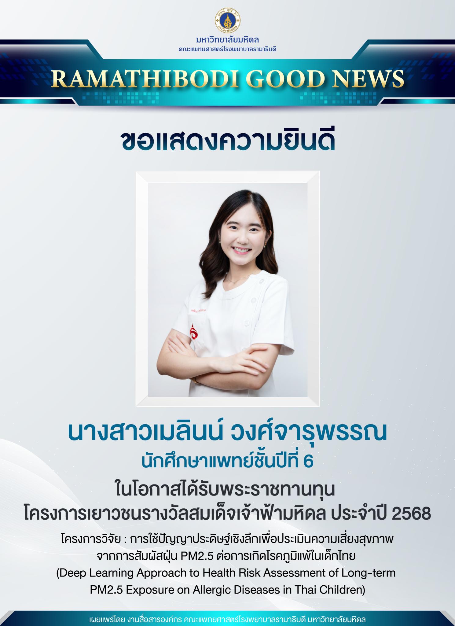 ขอแสดงความยินดี นางสาวเมลินน์ วงศ์จารุพรรณ นักศึกษาแพทย์ชั้นปีที่ 6