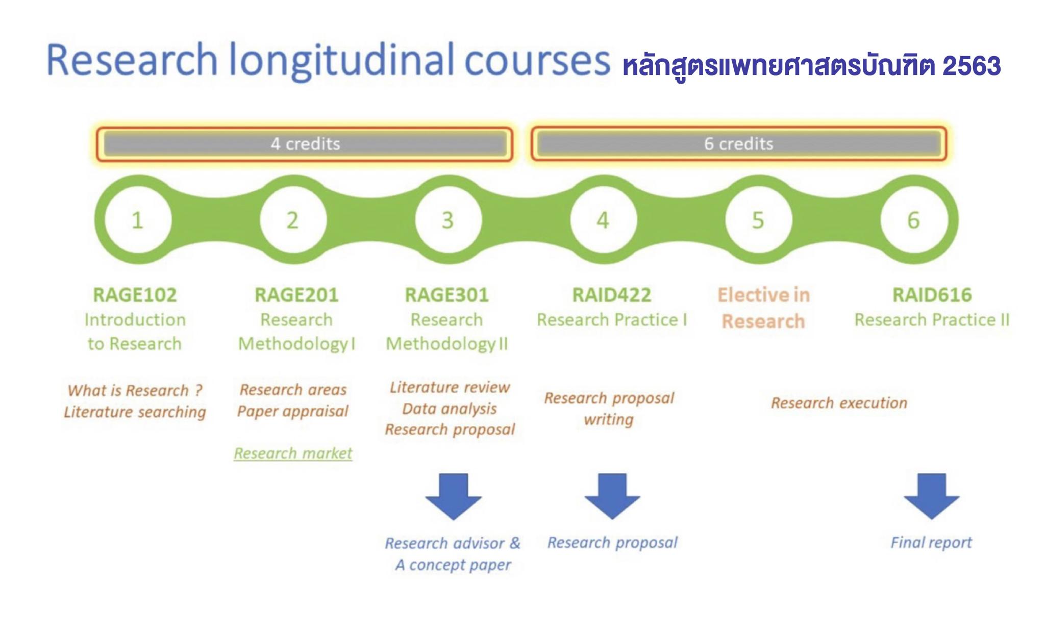 อาจารย์ที่ปรึกษาวิจัยในหลักสูตรแพทยศาสตรบัณฑิต บทบาทอาจารย์ที่ปรึกษาวิจัยในหลักสูตรแพทยศาสตรบัณฑิต กลุ่มรายวิชาปฏิบัติการวิจัย สรุปรายวิชาวิจัย หลักสูตรแพทยศาสตรบัณฑิต ฉบับปรับปรุง 2562 การขอเทียบโอนหน่วยกิตรายวิชาปฏิบัติการวิจัย1 (RAID422) การขอเทียบโอนหน่วยกิตรายวิชาปฏิบัติการวิจัย2 (RAID616) เอกสาร guideline สำหรับอาจารย์ที่ปรึกษาวิจัย เอกสาร guideline สำหรับนักศึกษา Concept Paper Template แบบประเมินการทำงานนักศึกษา RAGE 301 เอกสาร DIGESTED RESEARCH GUIDE เอกสาร Guideline สำหรับนักศึกษา(หลักสูตรแพทยศาสตรบัณฑิต ฉบับปรับปรุง 2568)