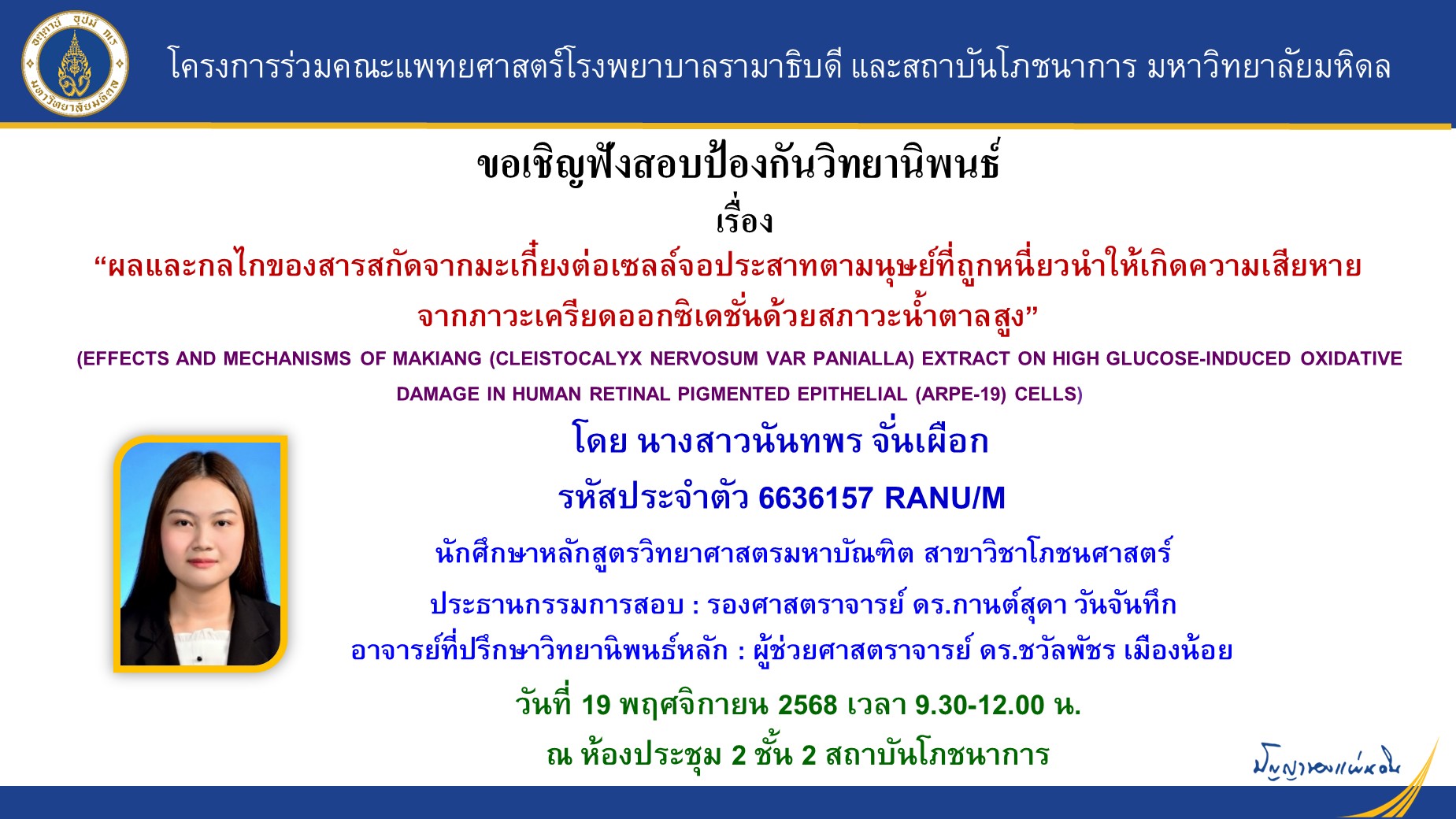 ขอเชิญฟังการสอบป้องกันวิทยานิพนธ์ นางสาวนันทพร จั่นเผือก นักศึกษาปริญญาโท สาขาวิชาโภชนศาสตร์ (ภาคปกติ)