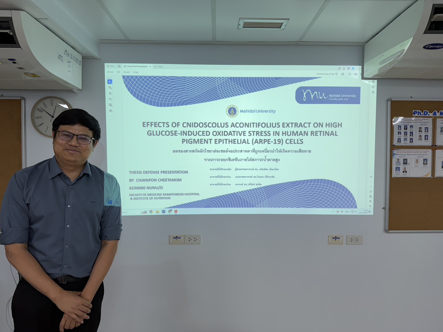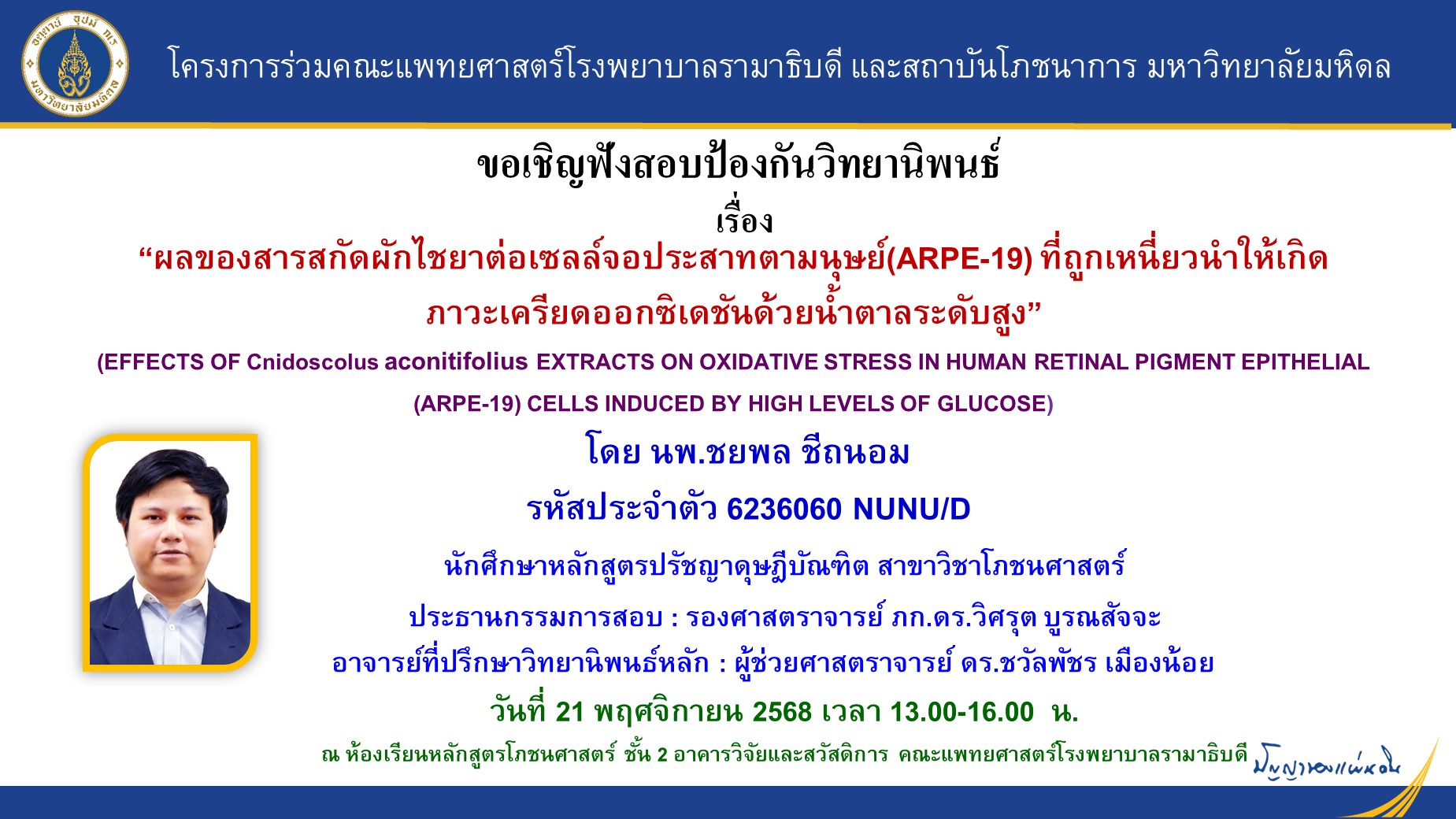 ขอเชิญฟังการสอบป้องกันวิทยานิพนธ์ นพ.ชยพล ชีถนอม นักศึกษาปริญญาเอก สาขาวิชาโภชนศาสตร์