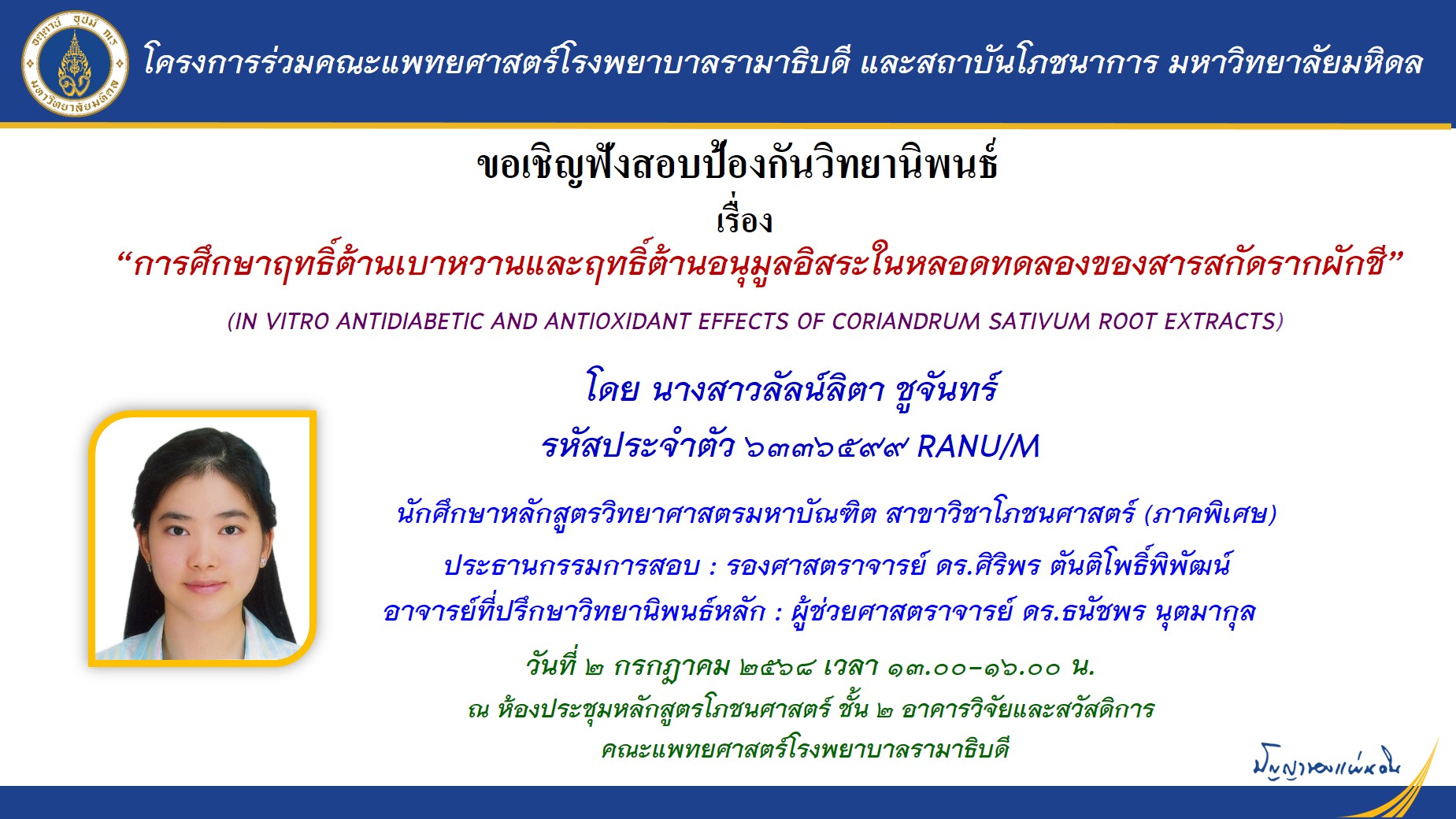 ขอเชิญฟังการสอบป้องกันวิทยานิพนธ์ น.ส. ลัลน์ลิตา ชูจันทร์ นักศึกษาปริญาโท สาขาวิชาโภชนศาสตร์(ภาคพิเศษ)