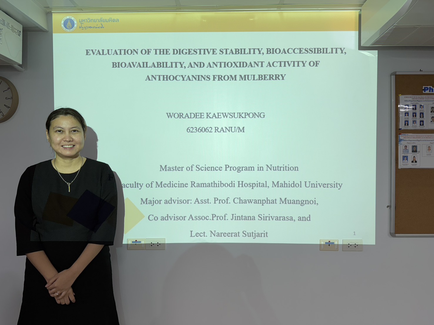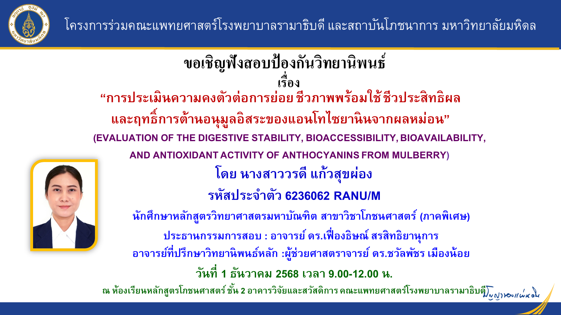 ขอเชิญฟังการสอบป้องกันวิทยานิพนธ์ นางสาววรดี แก้วสุขผ่อง นักศึกษาปริญญาโท สาขาวิชาโภชนศาสตร์ (ภาคพิเศษ)