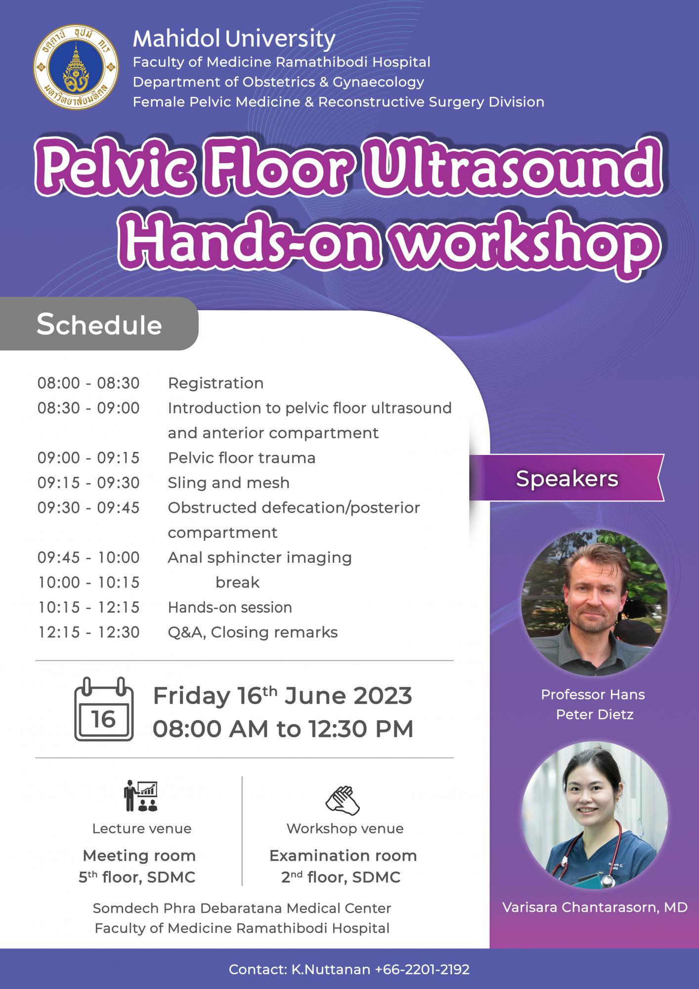 สาขาวิชาเวชศาสตร์เชิงกรานสตรีและศัลยกรรมซ่อมเสริม ภาควิชาสูติศาสตร์-นรีเวชวิทยา คณะแพทยศาสตร์โรงพยาบาลรามาธิบดี มหาวิทยาลัยมหิดล ขอเชิญผู้สนใจเข้าร่วมฟังบรรยาย "Pelvic floor ultrasound hand-on workshop"