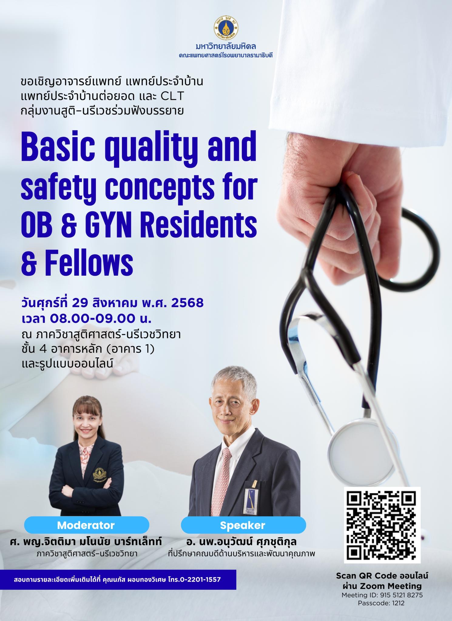 ขอเชิญรับฟังบรรยายเรื่อง "Basic quality and safety concepts for OB&GYN residents & fellows"