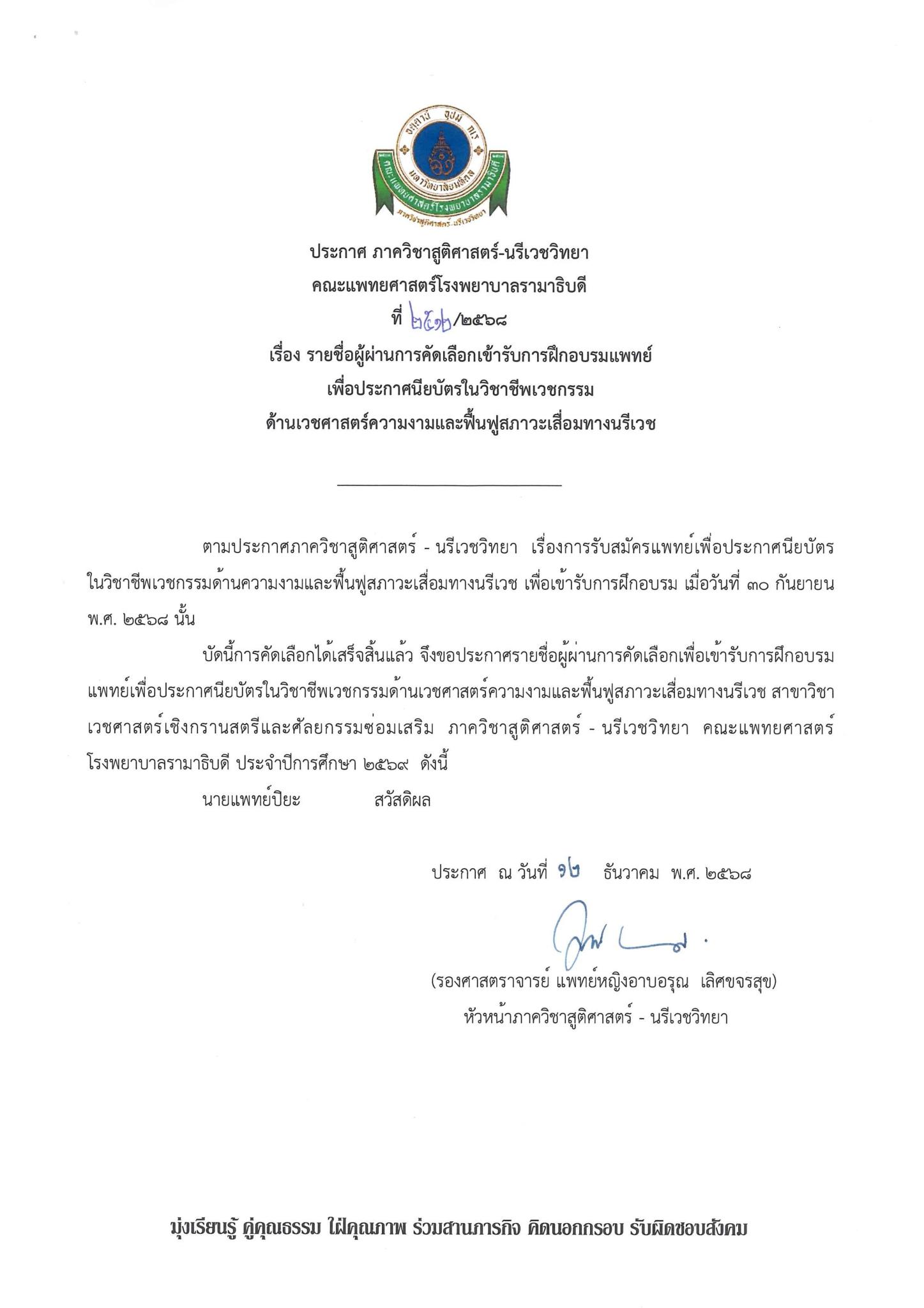 ประกาศรายชื่อผู้ผ่านการคัดเลือกเพื่อเข้ารับการฝึกอบรมแพทย์เพื่อประกาศนียบัตรในวิชาชีพเวชกรรมด้านความงามและฟื้นฟูสภาวะเสื่อมทางนรีเวช ประจำปีการศึกษา 2569