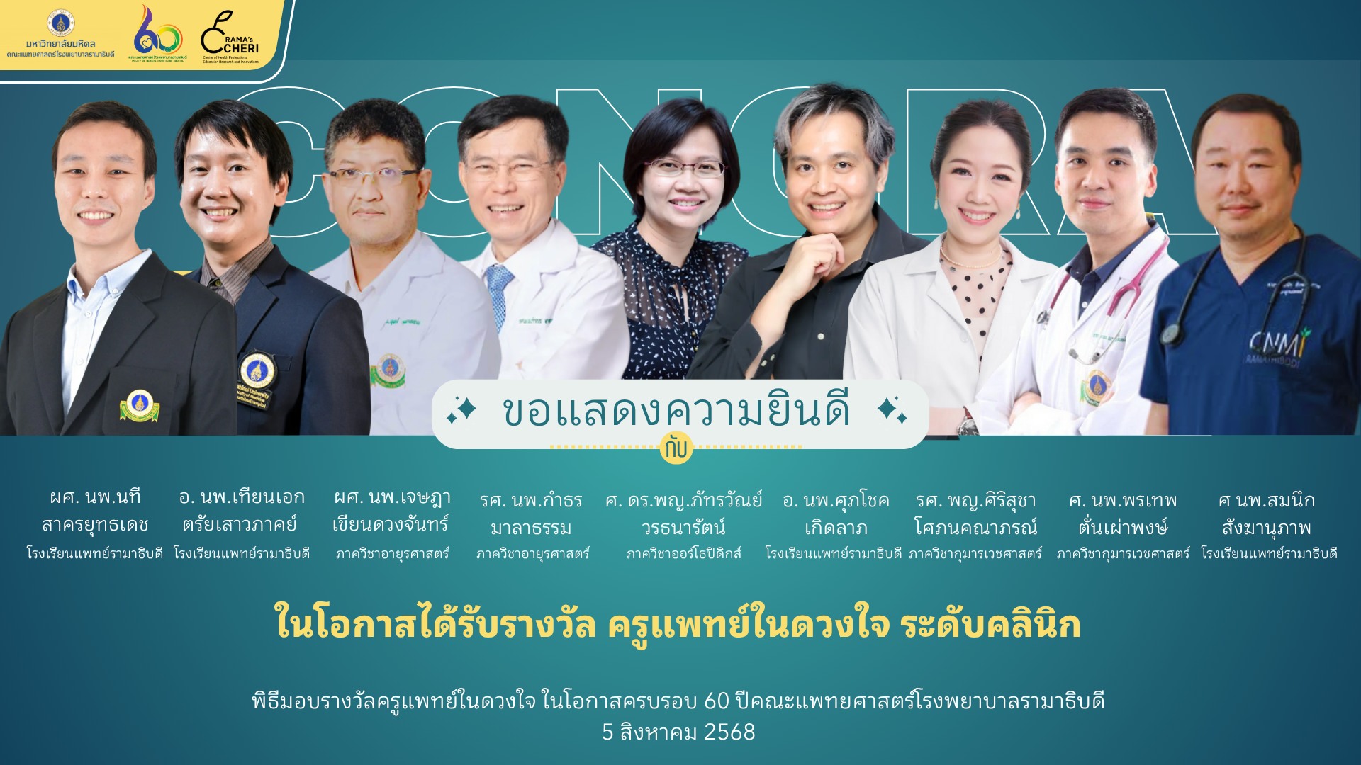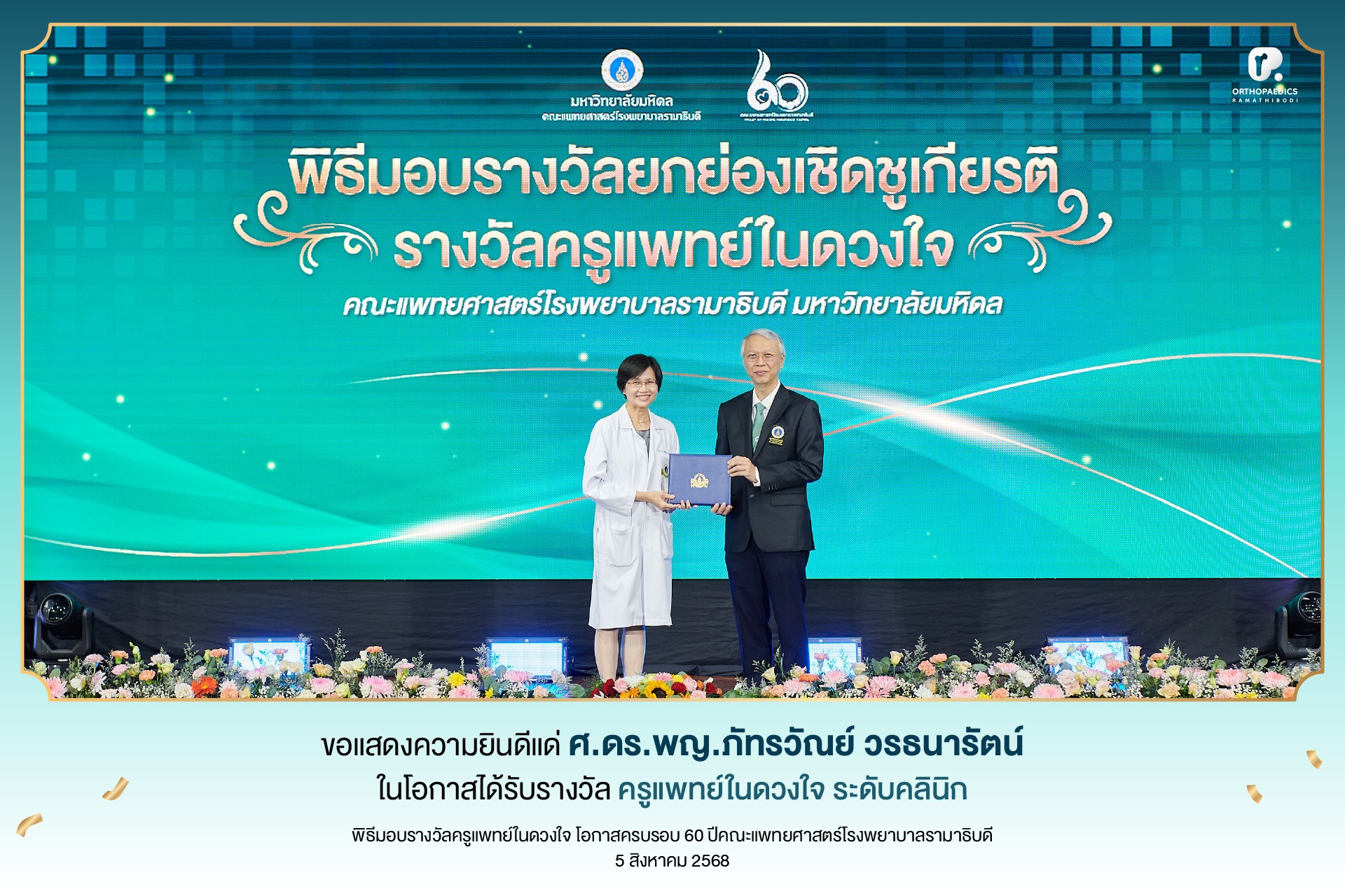 วันที่ 5 สิงหาคม 2568 - ภาควิชาออร์โธปิดิกส์ ขอแสดงความยินดีแด่ ศ.ดร.พญ.ภัทรวัณย์ วรธนารัตน์ กับรางวัล “ครูแพทย์ในดวงใจ” ระดับคลินิก เนื่องในโอกาส ครบรอบ 60 ปี คณะแพทยศาสตร์โรงพยาบาลรามาธิบดี โดยมี ศาสตราจารย์คลินิก นายแพทย์อาทิตย์ อังกานนท์ คณบดีคณะแพทยศาสตร์โรงพยาบาลรามาธิบดี มอบเกียรติบัตร ณ หอประชุมอารี วัลยะเสวี ภาควิชาออร์โธปิดิกส์ร่วมความภาคภูมิใจกับ ศ.ดร.พญ.ภัทรวัณย์ วรธนารัตน์