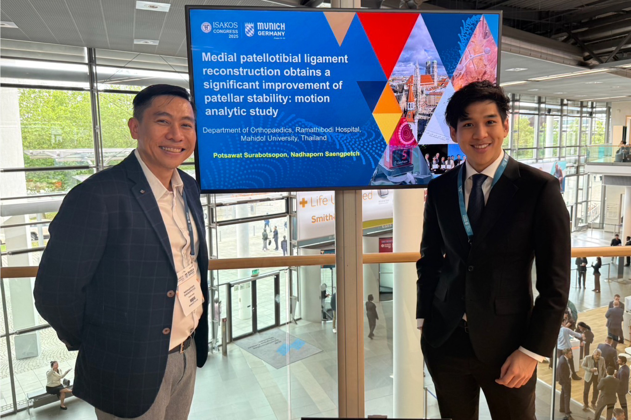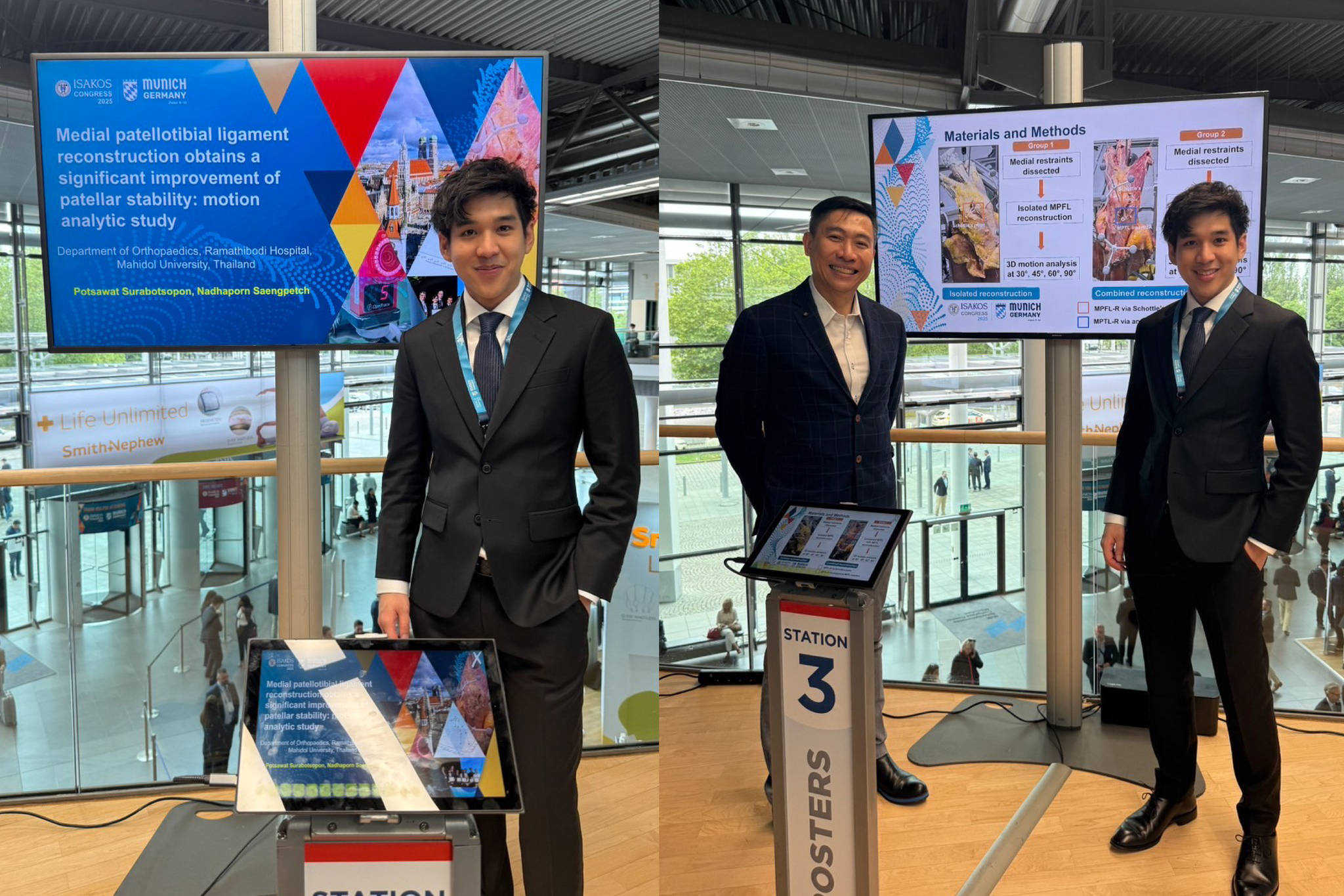 วันที่ 6 มิถุนายน 2568 - ภาควิชาออร์โธปิดิกส์ ขอแสดงความยินดีกับขอแสดงความยินดีกับ นพ.พศวัต สุรบถโสภณ ที่ได้นำเสนอผลงานวิจัย “Medial patellotibial ligament reconstruction obtains a significant improvement of patellar stability: motion analytic study” ในงาน 15th Biennial ISAKOS Congress 2025 ระหว่างวันที่ 8–10 มิถุนายน 2568 ณ International Congress Center Messe München, Germany