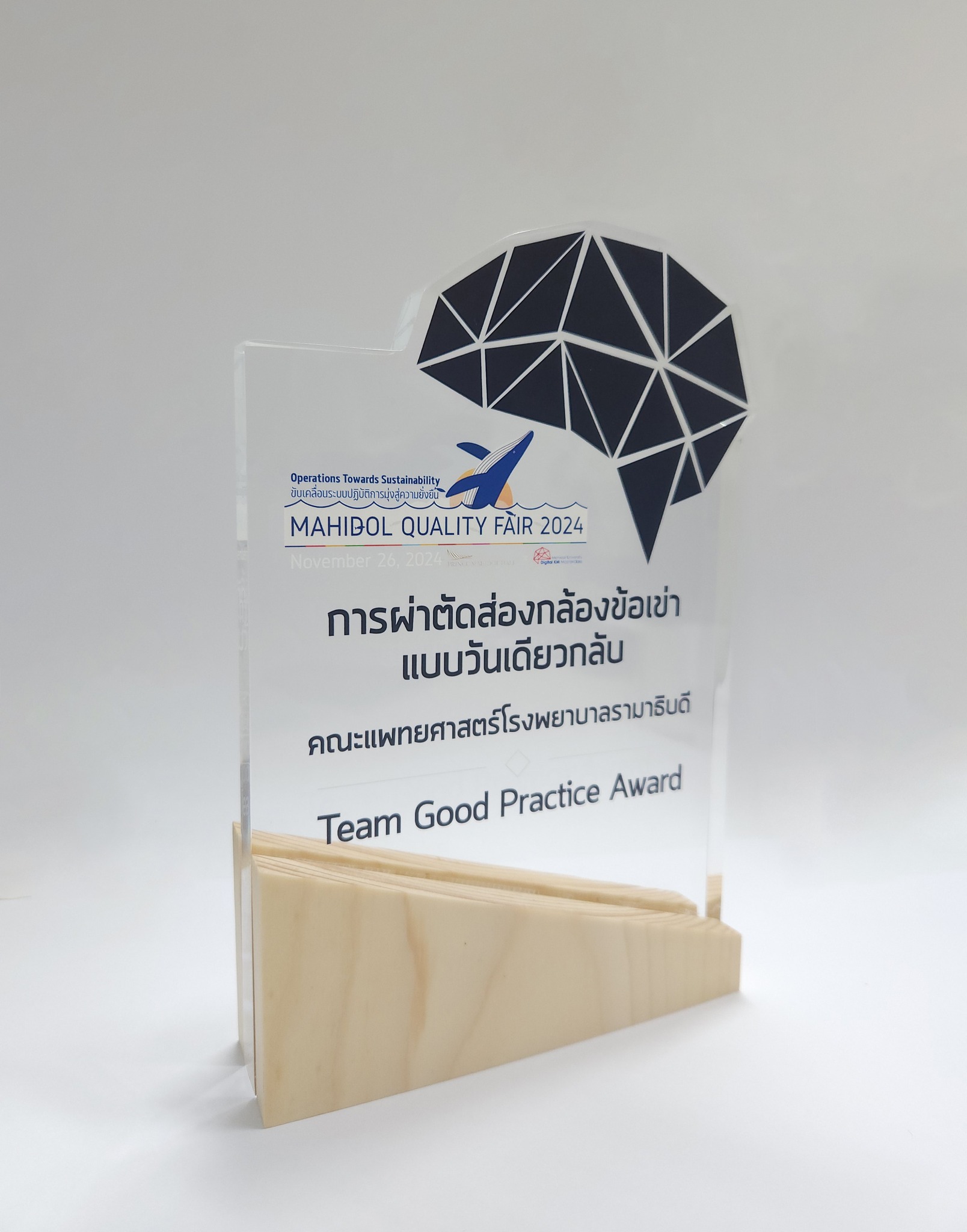 วันที่ 26 พฤศจิกายน 2567 - ภาควิชาออร์โธปิดิกส์ ขอแสดงความยินดีกับรองศาสตราจารย์ นายแพทย์ณัฐพร แสงเพชร พร้อมด้วยทีมผ่าตัดส่องข้อเข่าแบบวันเดียวกลับ (Ambulatory Knee Arthroscopic Surgery : AKAS) ที่ได้รับรางวัล Team Good Practice Award ในงานมหกรรมคุณภาพมหาวิทยาลัยมหิดล ประจำปี 2567 (Mahidol Quality Fair 2024) ณ หอประชุมมหิดลสิทธาคาร มหาวิทยาลัยมหิดล ศาลายา