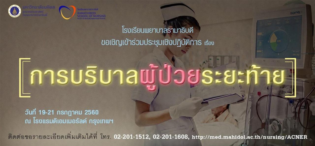 โรงเรียนพยาบาลรามาธิบดี ขอเชิญชวนบุคลากรทางการแพทย์ทุกท่าน เข้าร่วม "ประชุมเชิงปฏิบัติการเรื่อง การบริบาลผู้ป่วยระยะท้าย" ในวันที่ 19-21 กรกฎาคม 2560 ณ โรงแรมดิเอมเมอรัลด์ กรุงเทพฯ