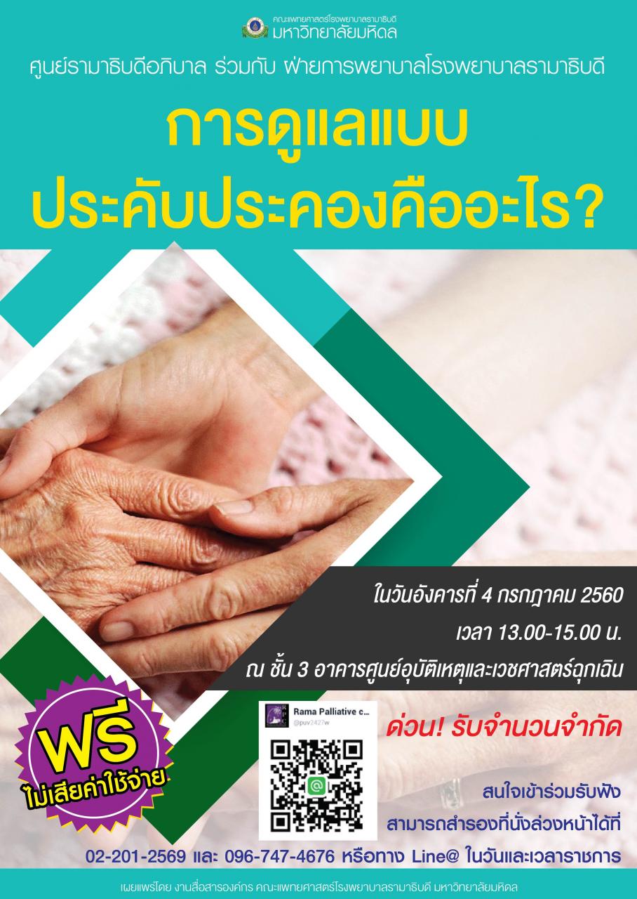 ศูนย์รามาธิบดีอภิบาล ร่วมกับ ฝ่ายการพยาบาลโรงพยาบาลรามาธิบดี ขอเชิญญาติและผู้ดูแลผู้ป่วยโรคเรื้อรัง เข้าร่วมโครงการอบรมประชาชน ในหัวข้อเรื่อง "การดูแลแบบประคับประคองคืออะไร?" ในวันอังคารที่ 4 กรกฎาคม 2560 ณ ศูนย์อุบัติเหตุฯ ชั้น 3 เวลา 13.00 - 15.00 น.ผู้สนใจสามารถสำรองที่นั่งล่วงหน้าได้ที่ 02-2012569 ในวันและเวลาราชการ ด่วน! รับจำนวนจำกัด
