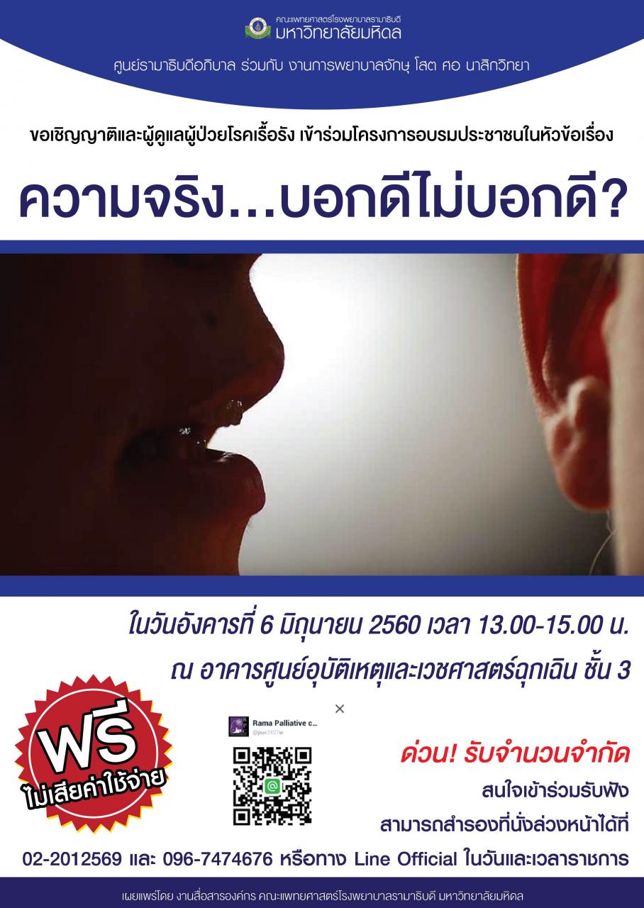 ศูนย์รามาธิบดีอภิบาล ร่วมกับ งานการพยาบาลจักษุ โสต ศอ นาสิกวิทยา ขอเชิญญาติและผู้ดูแลผู้ป่วยโรคเรื้อรัง เข้าร่วมโครงการอบรมประชาชน ในหัวข้อเรื่อง " ความจริง.... บอกดีไม่บอกดี? " ในวันอังคารที่ 6 มิถุนายน 2560 ณ ศูนย์อุบัติเหตุฯ ชั้น 3 เวลา 13.00 - 15.00 น.ผู้สนใจสามารถสำรองที่นั่งล่วงหน้าได้ที่ 02-2012569 ในวันและเวลาราชการ ด่วน! รับจำนวนจำกัด