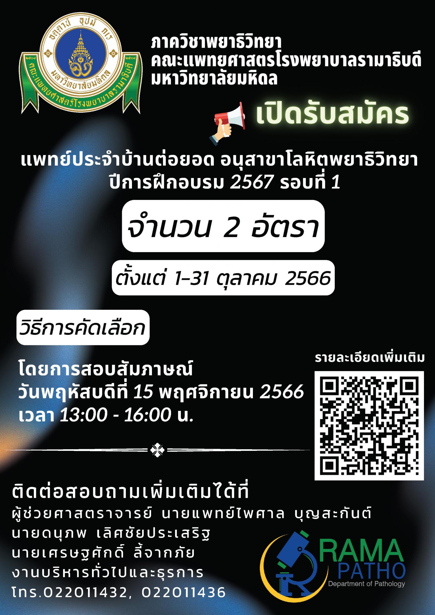 รับสมัครแพทย์ประจำบ้านต่อยอด อนุสาขาโลหิตพยาธิวิทยา