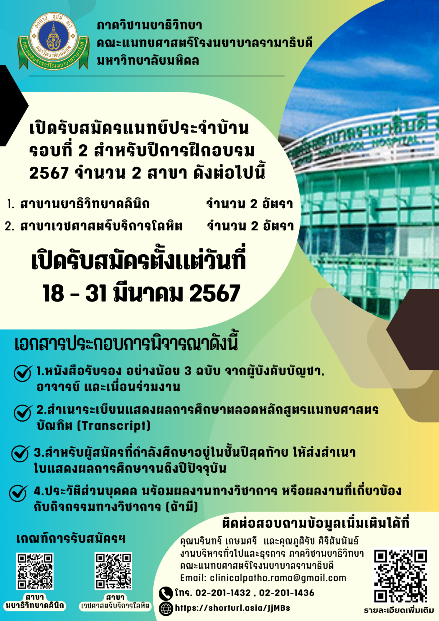 เกณฑ์การรับสมัครแพทย์ประจำบ้าน สาขาพยาธิวิทยาคลินิก และ สาขาเวชศาสตร์บริการโลหิต ปีการศึกษา 2567